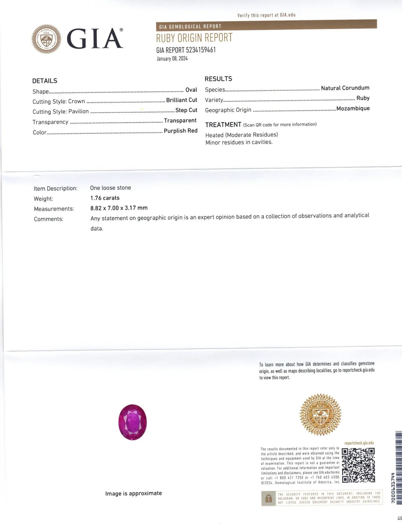 Dazzling 1.76 Ct Purplish Red Ruby is an oval brilliant cut measuring 8.82 x 7.00 x 3.17 mm. Reveals a medium tone and strong saturation. Do not miss this gorgeous gem! Origin: Mozambique. Treatment: Heat only. Please see the certification for additional information.