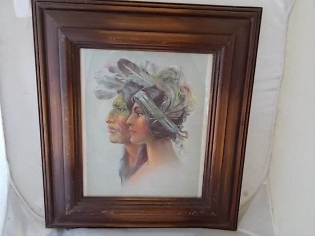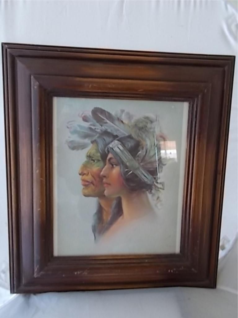 print of a man and woman. Exceptional colors. From the collection of Good Time Charlie Cartwright, legendary tattoo artist famous for black and grey tattoo artistry. Charlie admired the American Indian and collected the