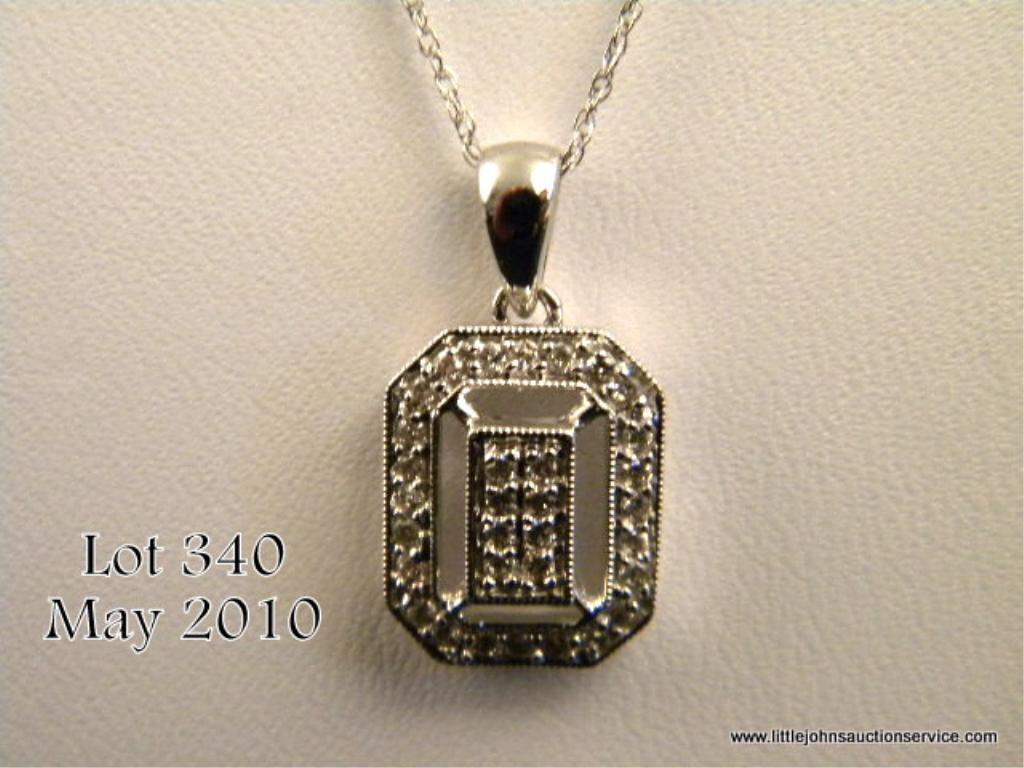 Beautiful 14 karat white gold ladies designer pendant pave set with 32 round diamonds weighing approx. 0.30 carats of F-G-H colors and VS/SI clarity. Retail $1,150.00 Estimate $300-$600 A fine item