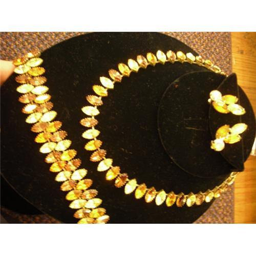 Amazing 1950?s three piece prong set, pear shaped rhinestone necklace, earring and bracelet set. Rich yellow and amber colored. Bracelet is two layer rhinestone, cross stacked. Necklace is single layered, choker style. Earrings are four gem classic 50?s style cluster earrings, clip-on?s.