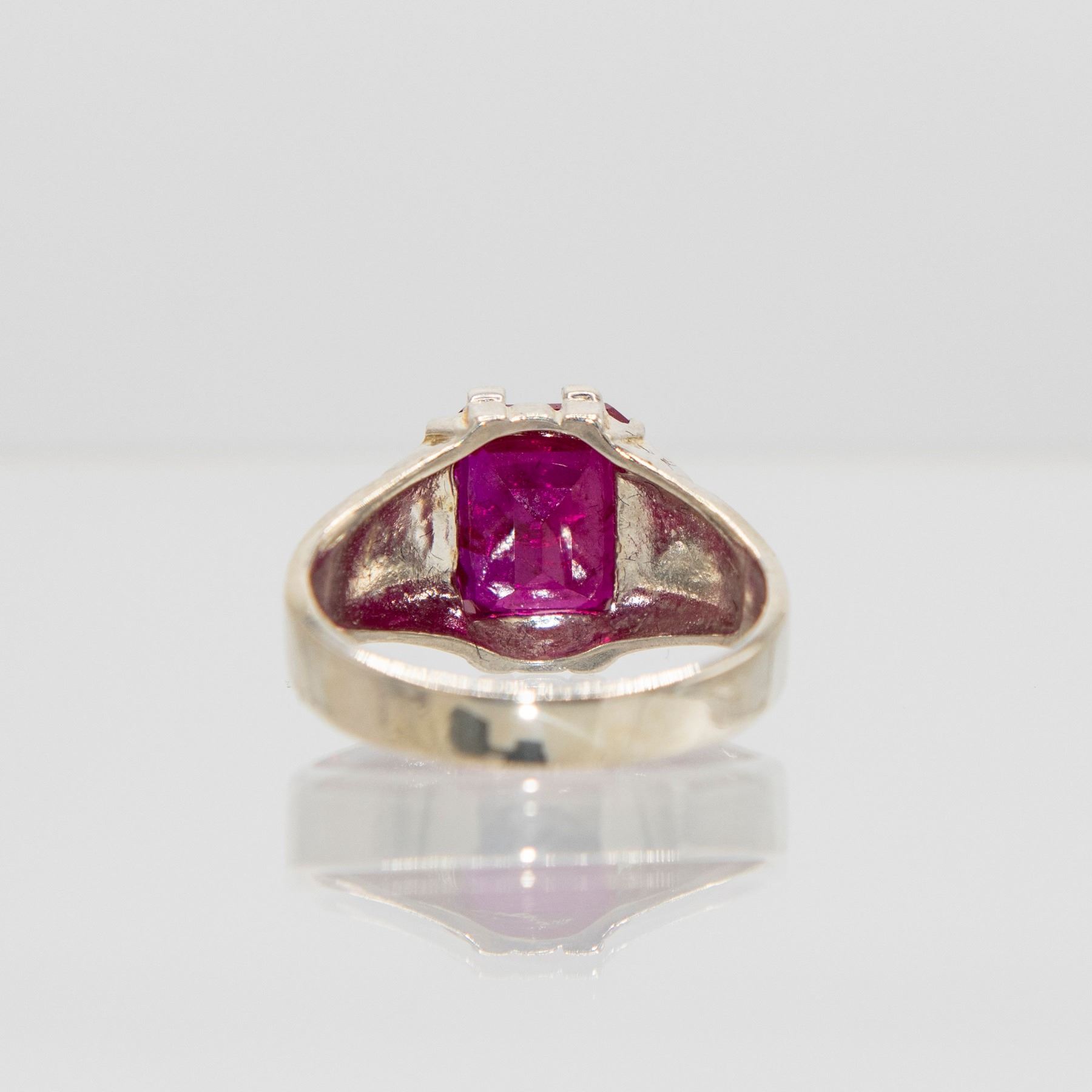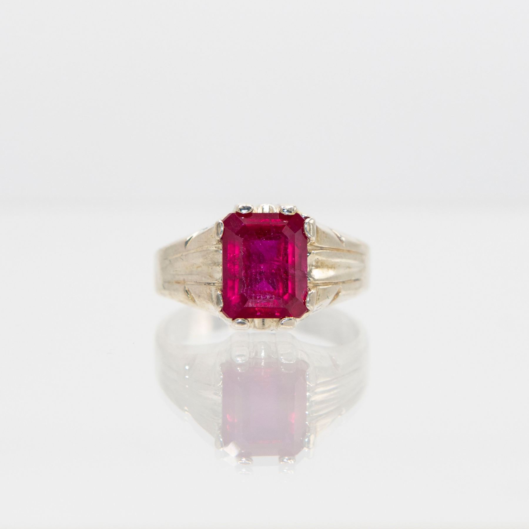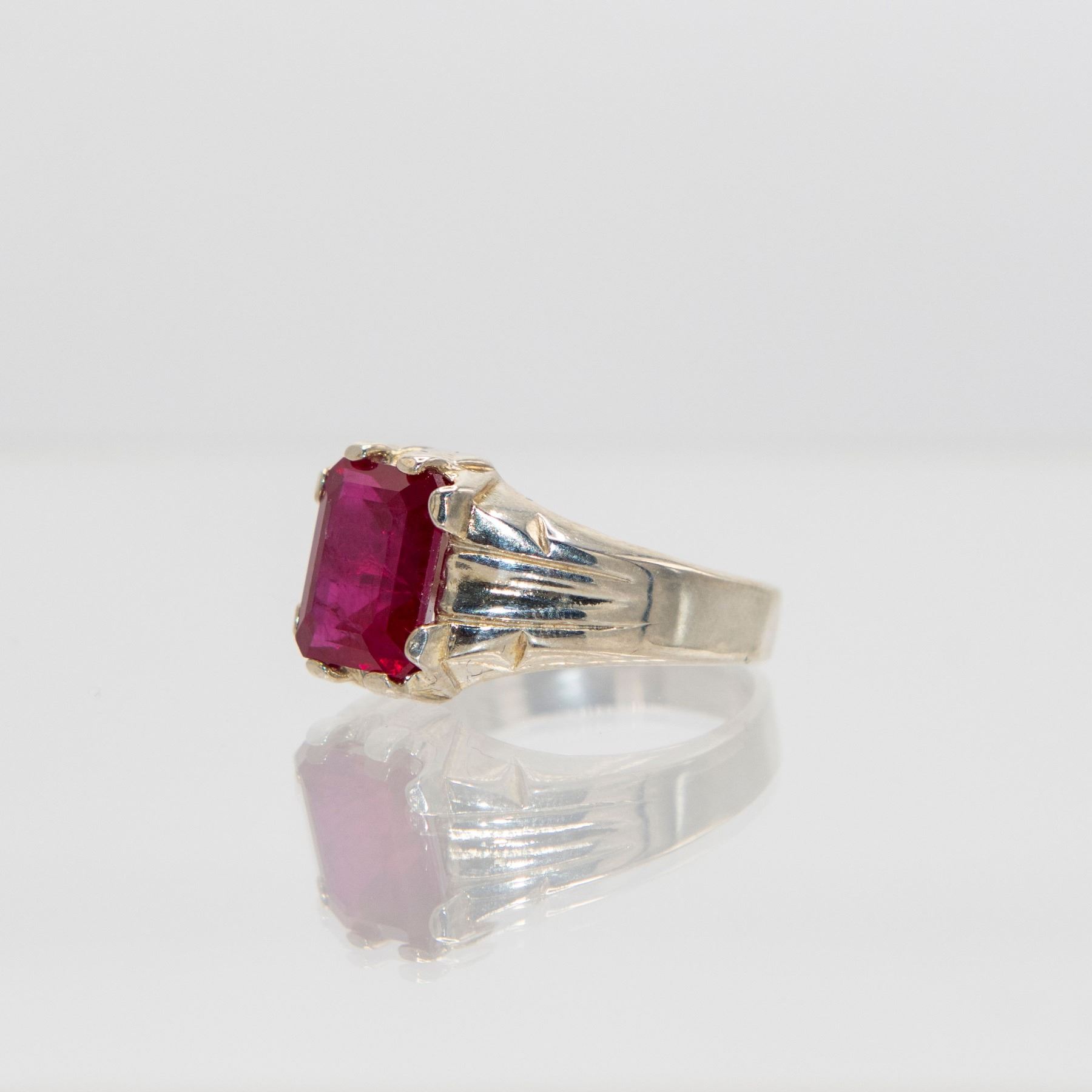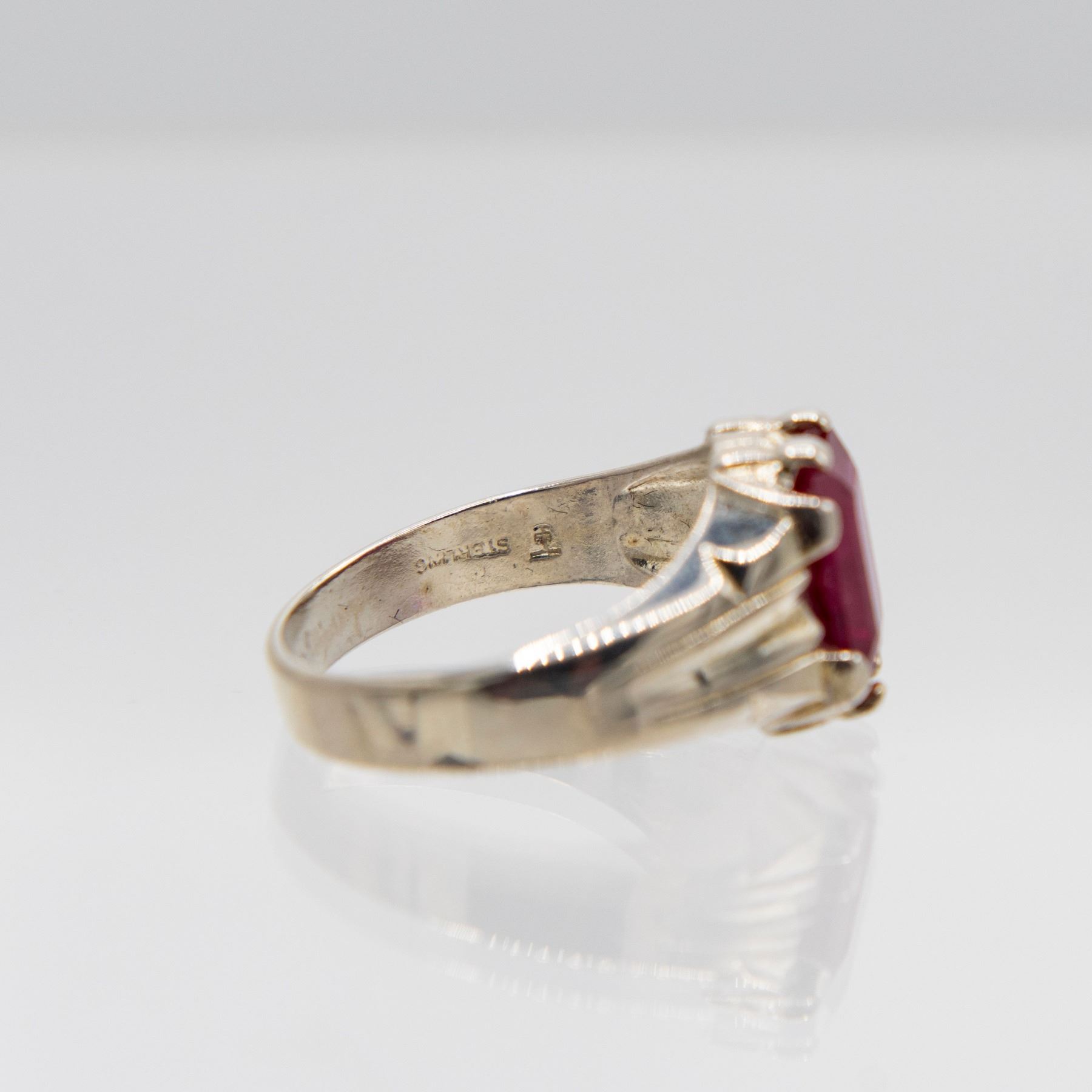 This lab created ruby ring is near flawless. Beautiful emerald cut mounted in elaborately designed solid .925 silver. Size 9. Total gram wt is 5.5 grams or 27.5 cttw. Please note : This ruby has the same chemical compound as natural, mined from the earth, ruby. Type Corundom. GIA Description. Some gemstones have synthetic counterparts that have essentially the same chemical, physical, and optical properties, but are grown by man in a laboratory. This lab ruby has the exact chemical composition : Al2O3Crystal Structure: Hexagonal Purity: 99.99% Refractive Index: 1.717 Density: 3.98-4.1 g/cm3 Hardness Mohs: 9. What a find for any gem enthusiast. The closest thing to real. Same exact chemical compounds as in a natural mined from the earth Burma ruby.