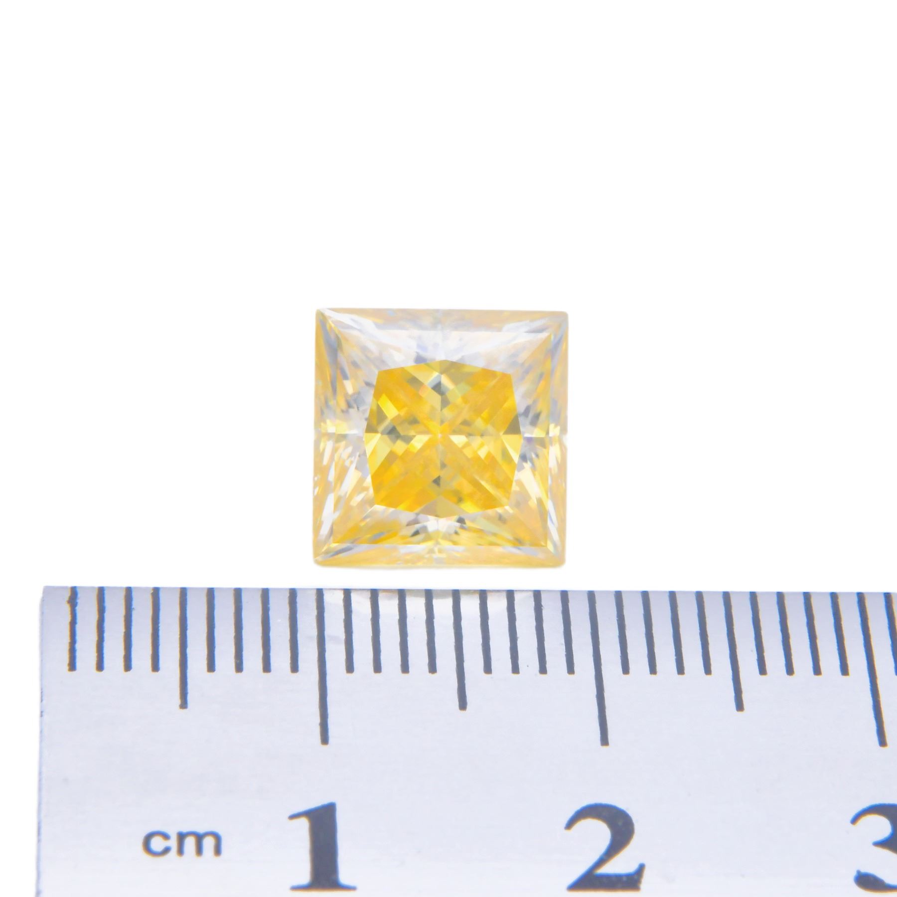 Beautiful 5 Ct Sparkling Soft Yellow VVs1 Fire Moissanite Solitaire. This Investment Grade Moissanite is a Fancy Princess Cut measuring 9.5 x 9.5. mm.It is Mellow Yellow in color. It is near flawless displaying a fine even hue. This Moissanite exhibits more brilliance than a natural diamond thanks to a dispersion that is 2.4 times higher. ***In addition, this Fire Moissanite measures 9.25 on the mohs hardness scale and will test positive for a diamond with almost any diamond tester*** It is also conflict free and earth friendly. Perfect for any setting or simply to add to your collection. This gemstone is Gorgeous!!!