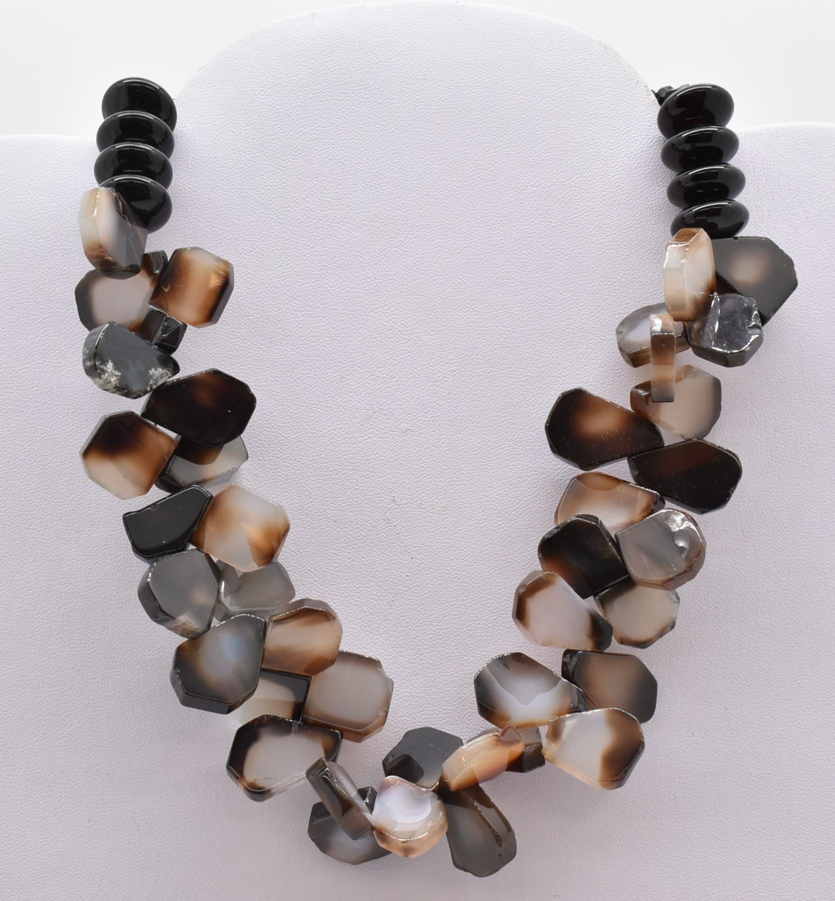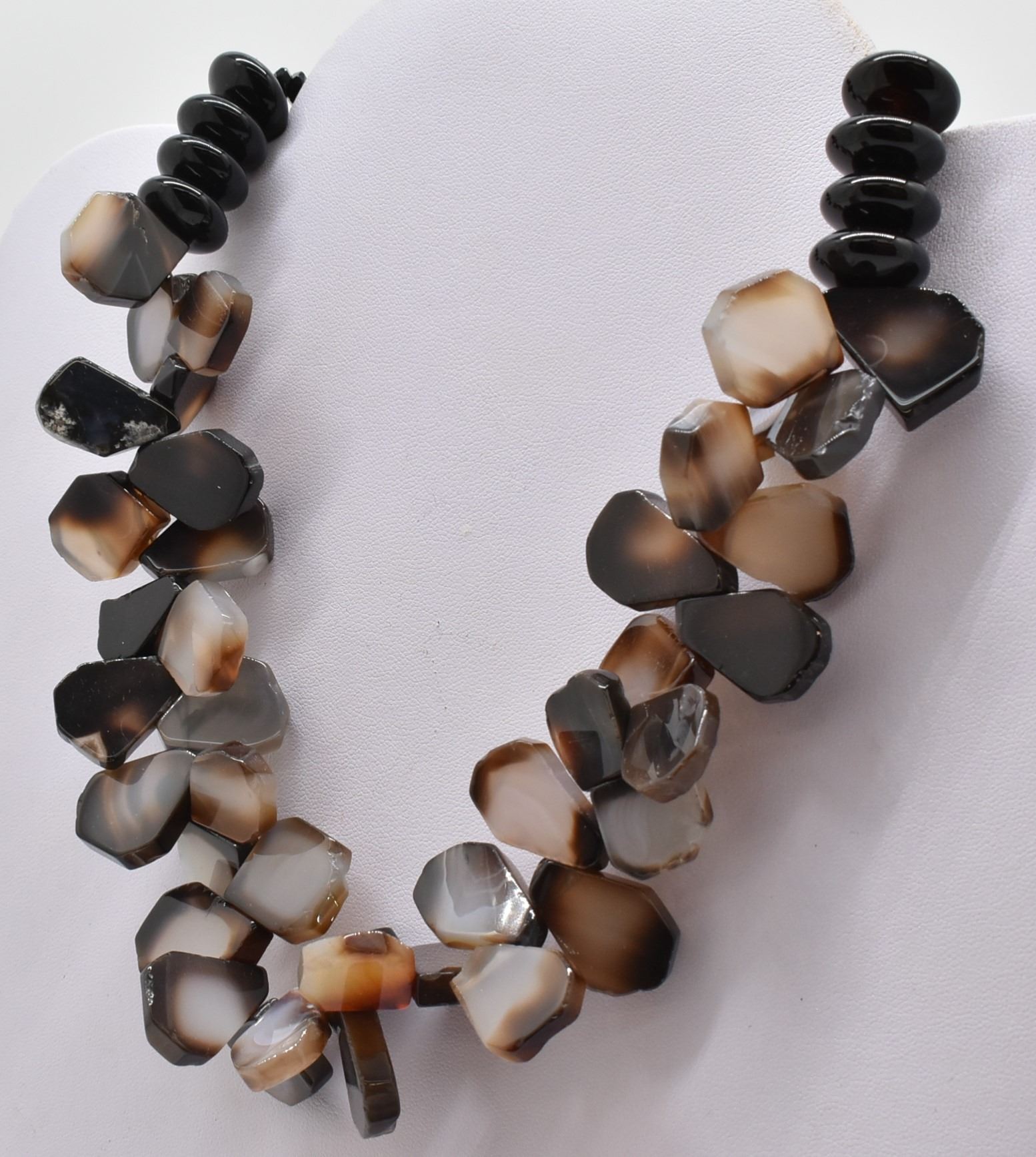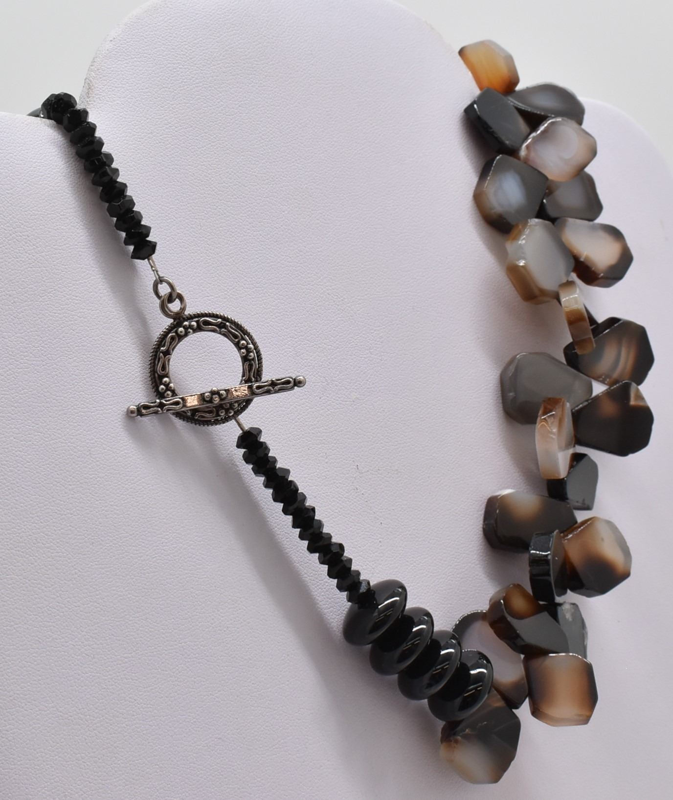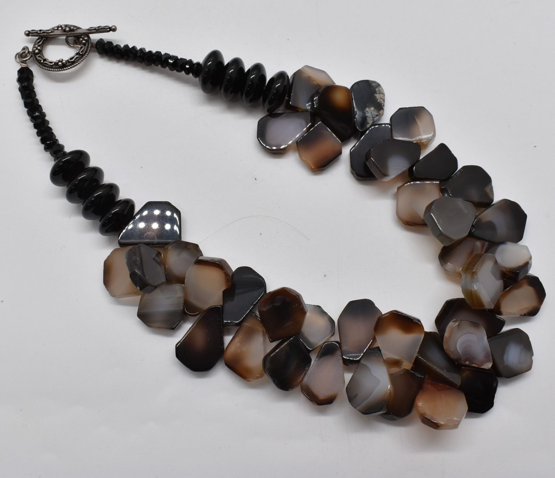 Beautiful Agate Necklace, measures 18''L end to end, silver-tone toggle clasp, embellished with black rondelles and faceted black beads