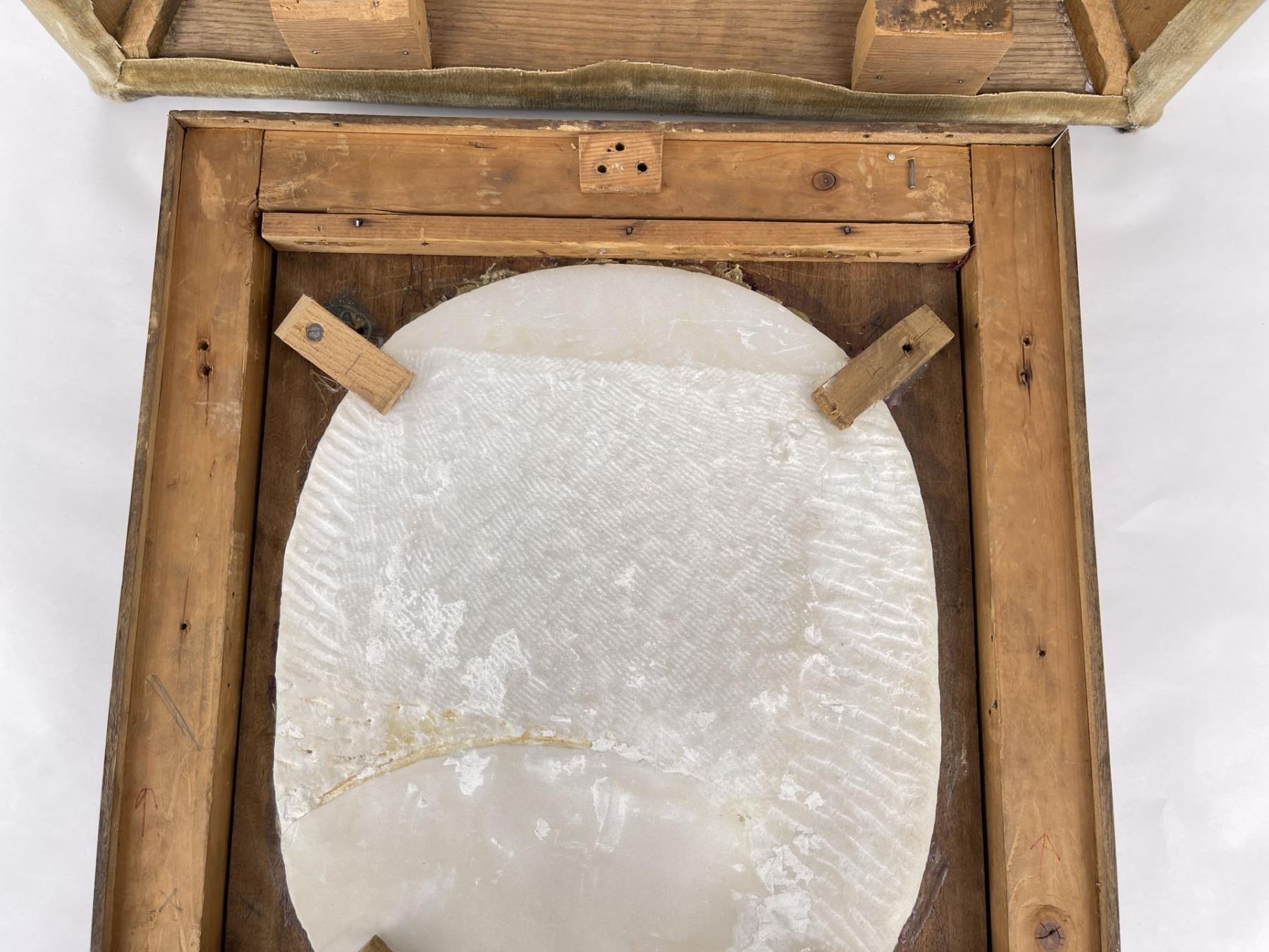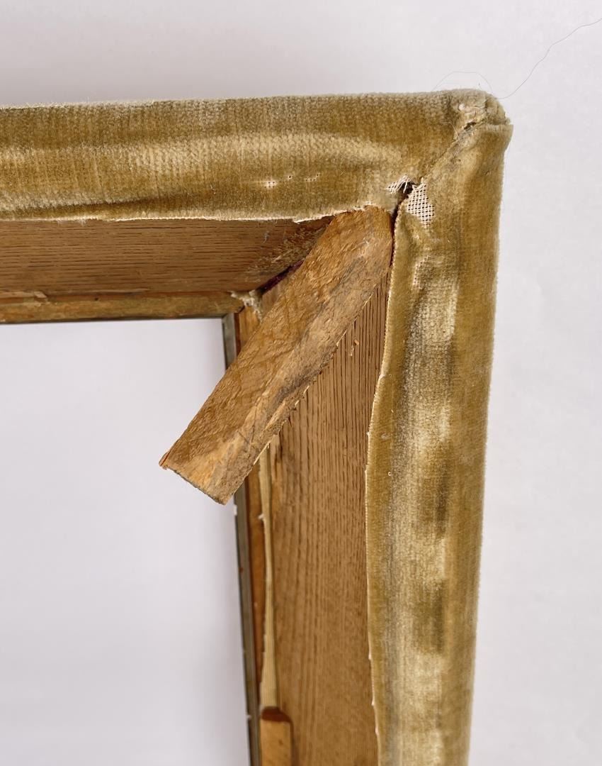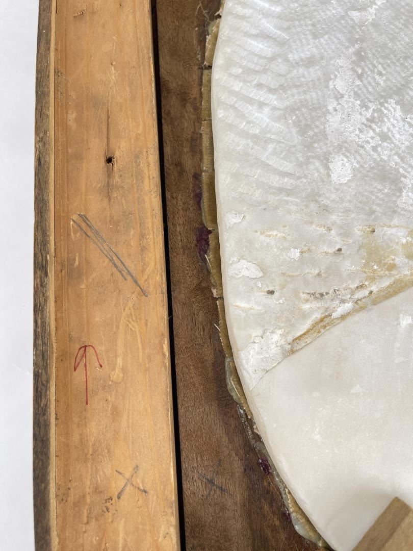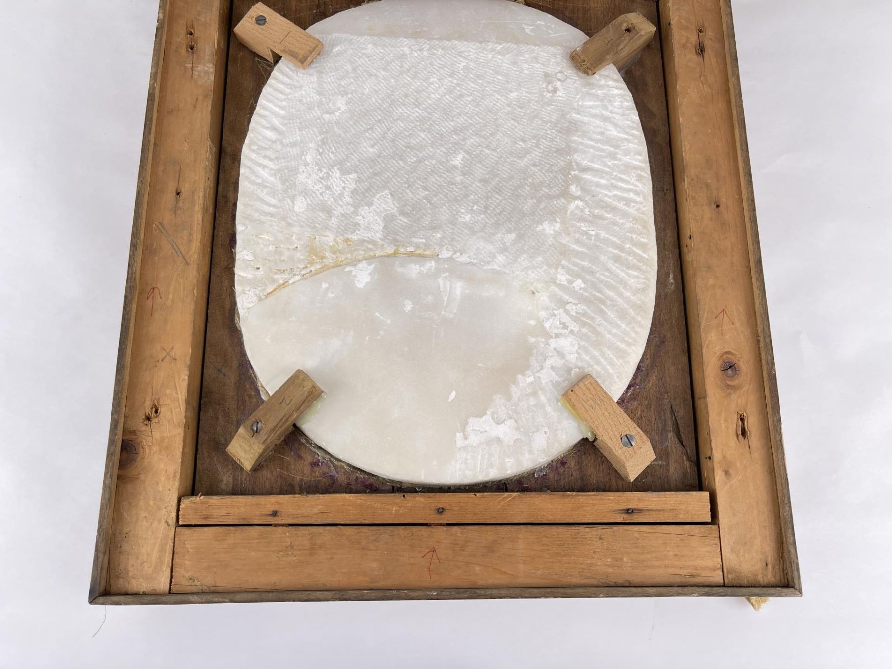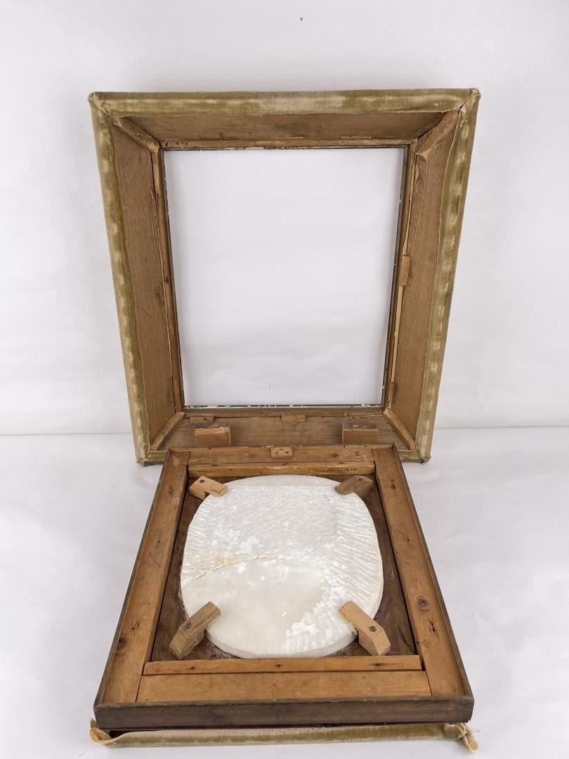 23" by 26" framed. Not signed. Frame needs conservation work. Can be shipped without frame.
