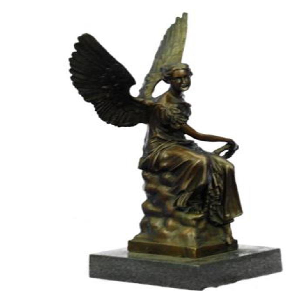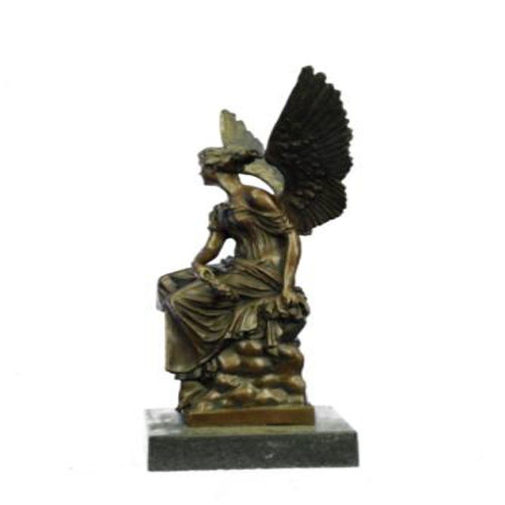 The beautiful angel sits upon her celestial throne having surveyed an earthly battle. She is captured in the likeness of ancient Roman Hellenistic representations of winged angels. The exquisite details in her long flowing robe and the feathers on her wings shows the skilled craftsmanship of the artist. We witness as she is about to throw a crown of laurel earth-bound to the successor of a martial victory. She is mounted upon a marble base. Bronze Dimensions with Marble Base: Height 16 X Width 7 inches. Weight: 10 LBS.