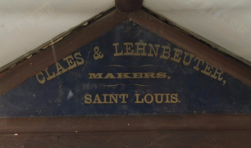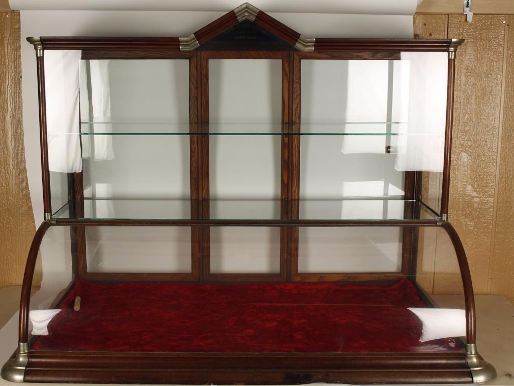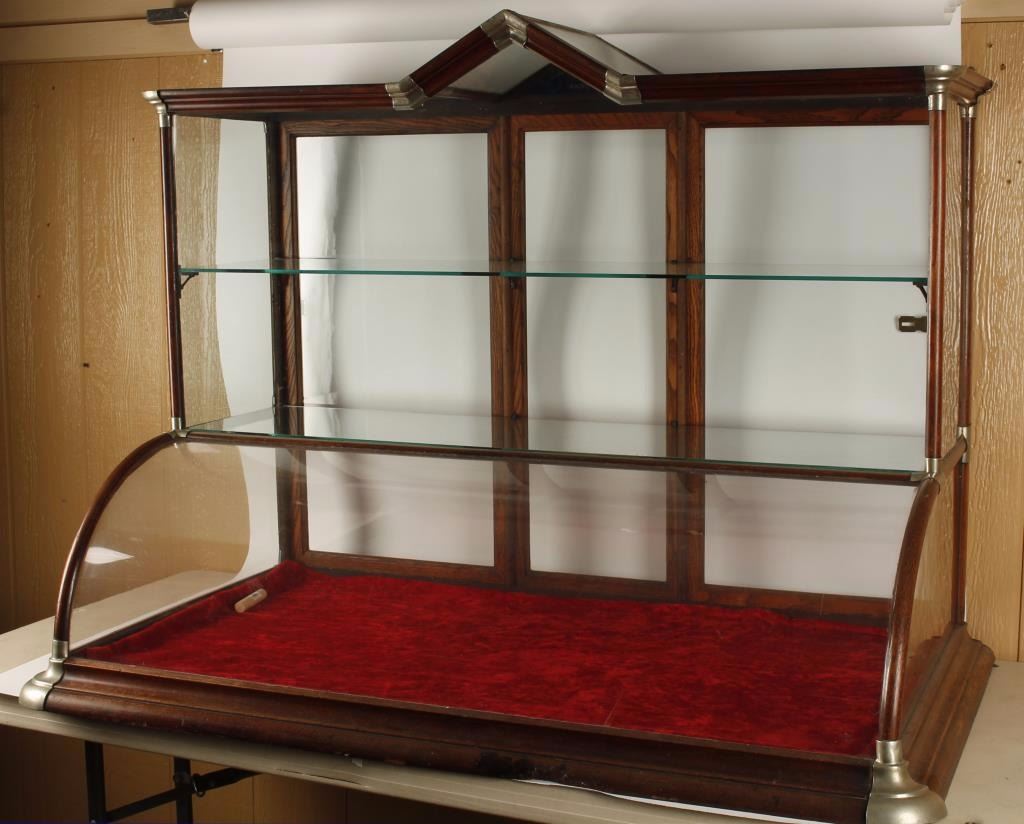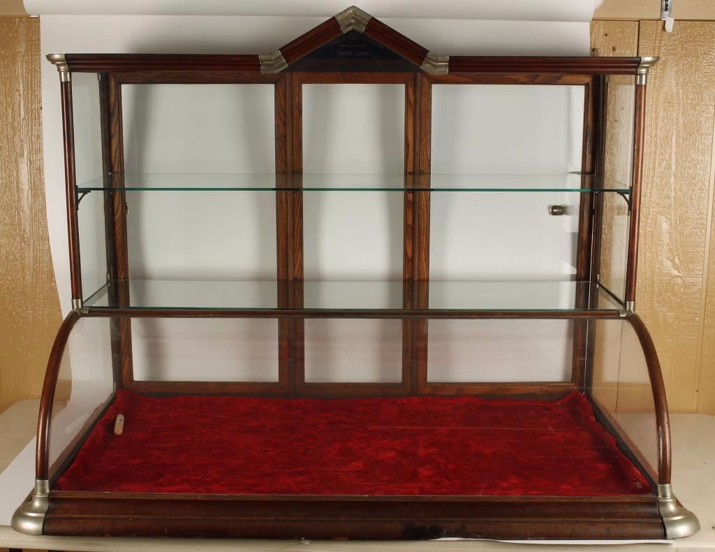 Red Crusted Velvet Lined, 2 Shelves, Claes & Lehnbeuter Makers St. Louis. Overall excellent condition. Clear glass with arched point center. Measure 51"X27.1/2"X41".