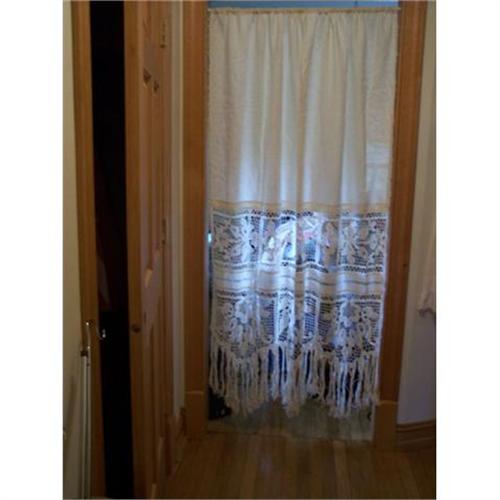 This is a beautiful curtain panel.Has a long fringe on the bottom with lots of cut work on the lower half.Shir-on rod pocket type.Measures approx. 72" long x 52" wide.Would be great over a solid colored shower curtain so the fancy work shows through.Or on a doorway that has no door and of course in that room that only has one window.Very nice condition.