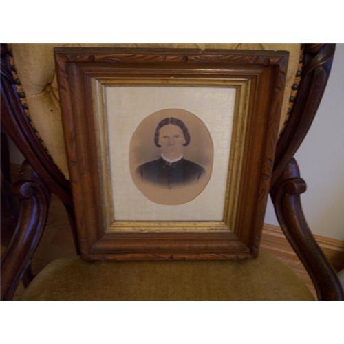 This is a wonderful frame with all the carved design around edge.Has a very early picture of a woman in it.On the back is a piece of paper that says-Elizabeth Cushman-Cy and Irvin Cushmans mother-Was Grandmother Spoons-Adeline Cushmans Vt.Buried in Viola,Wisconsin cemetary.Frame measures 14 1/2x12 1/2.Glass measures approx. 7 1/2x9 1/2.Frame is a little over 2" deep.