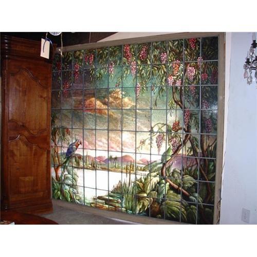 This unbelievable reverse glass painting was reclaimed from a mansion in Dallas, Texas this year. The home was designed by famed architect, Anton Korn in the 1920's. The piece itself is encased in leaded panels and framed in oak. It is in excellent condition!