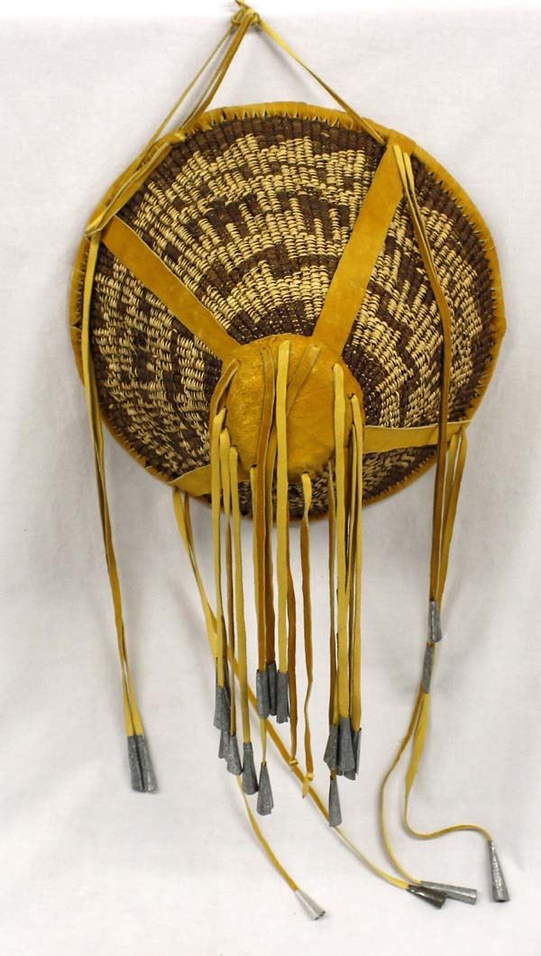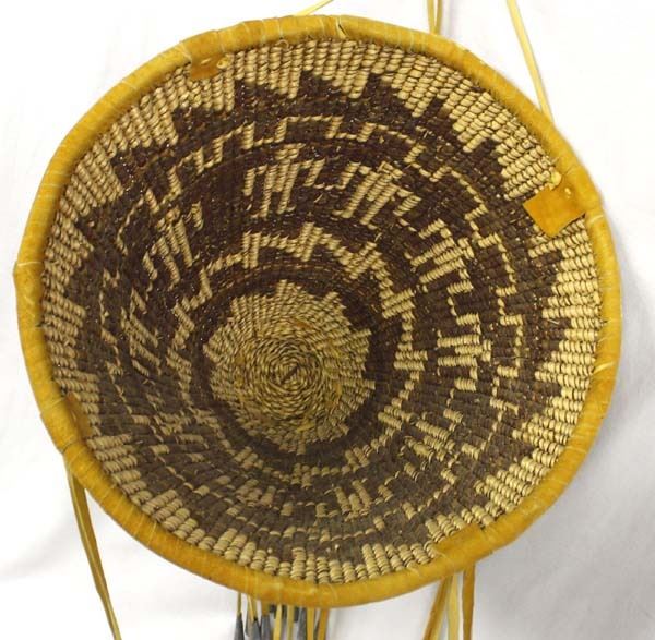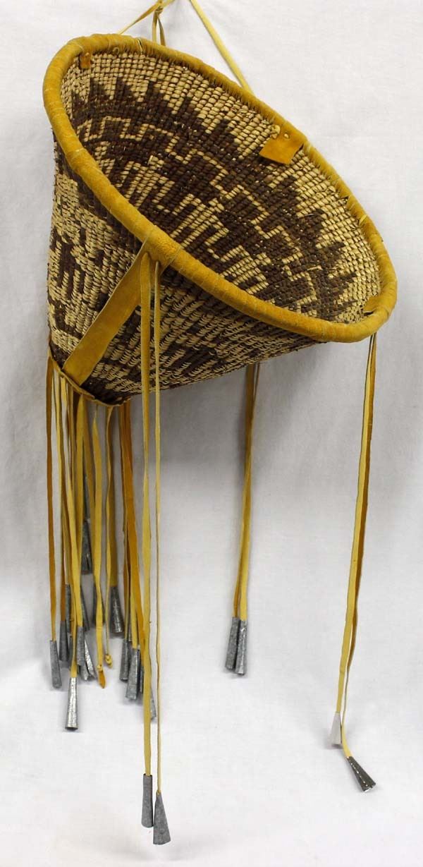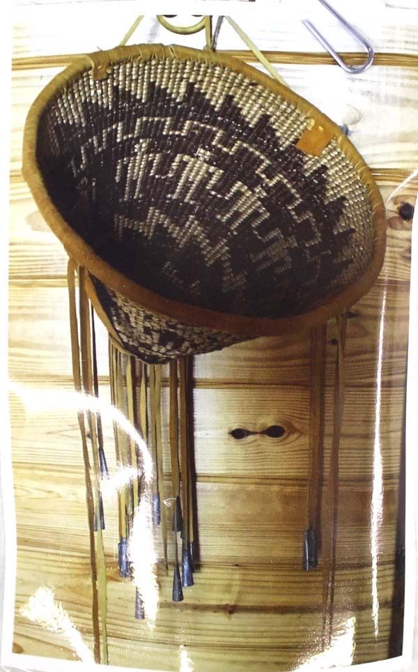 Beautiful Native American Apache Figural Burden Basket, embellished with leather fringe and tin jingles, well executed figural designs