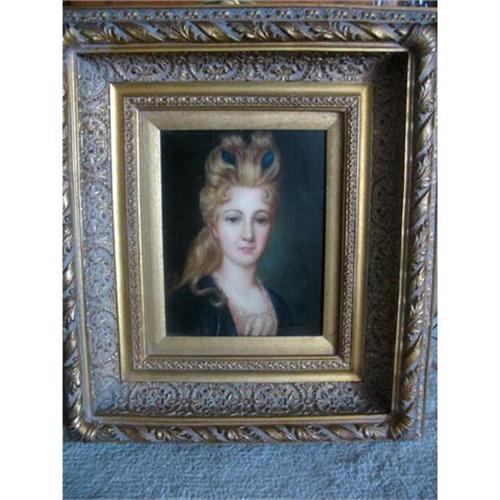Beautiful Old Oil painting of a young Victorian aristocratic woman.The oil is in a very ornate heavily carved frame.The frame measures 19" x 16.5".The painting has Esther written in the lower right hand corner.There is a lot of detail in the picture-the artist spent a lot of time with the intracacies of the subjects beautiful hair, face & dress.The artist captured a potrayal of a young woman that exudes peaceful confidence.One picture was taken with a flash -it captured the true gold frame.The other picture is more muted and flat.You will have to excuse me-I am just learning how to use this digital camera.
