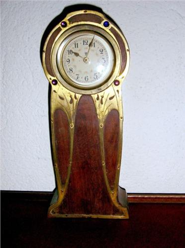 Joli réveil Jungstyl en forme d'horloge de parquet en bois et laiton doré, cadran émail