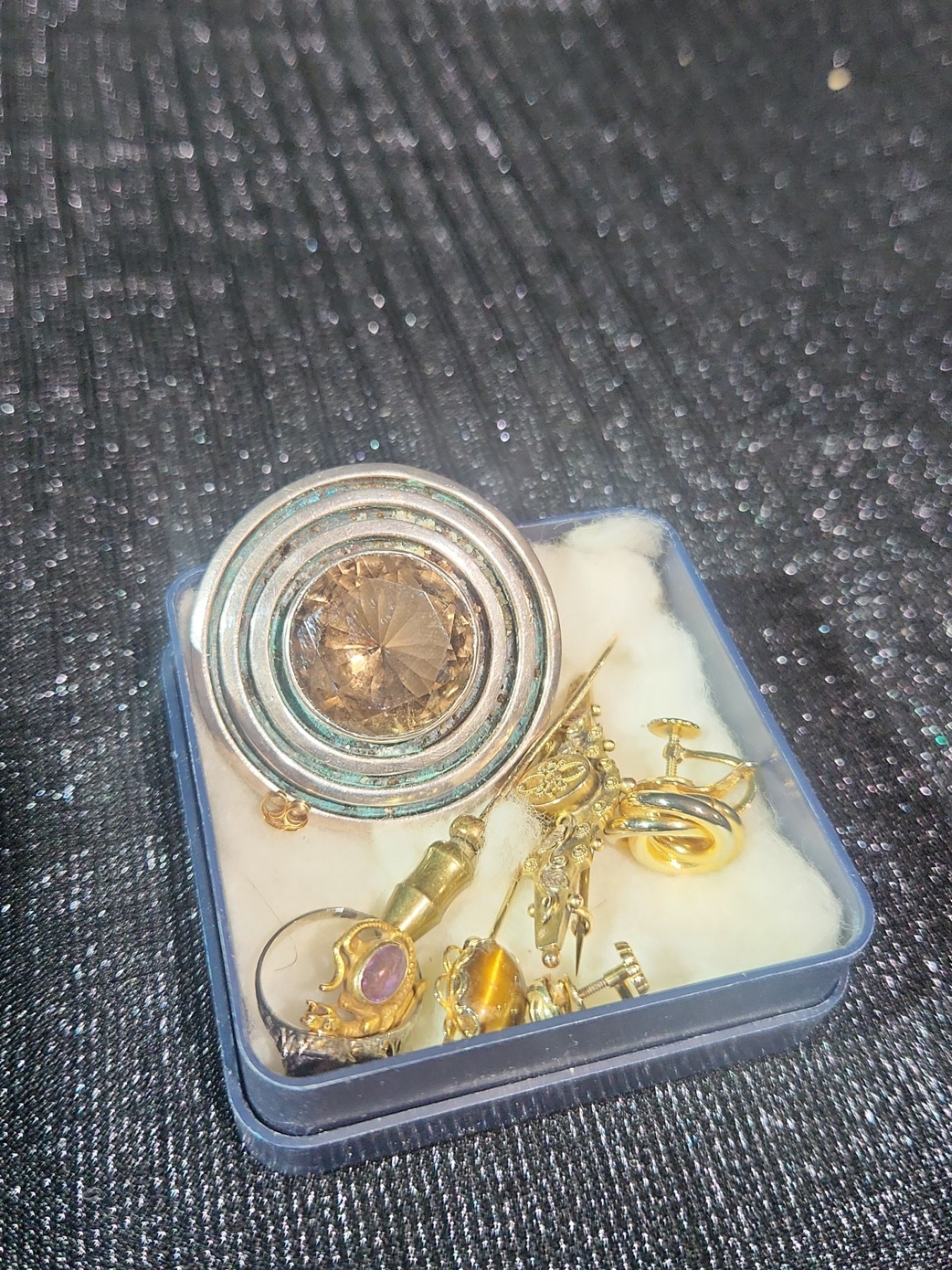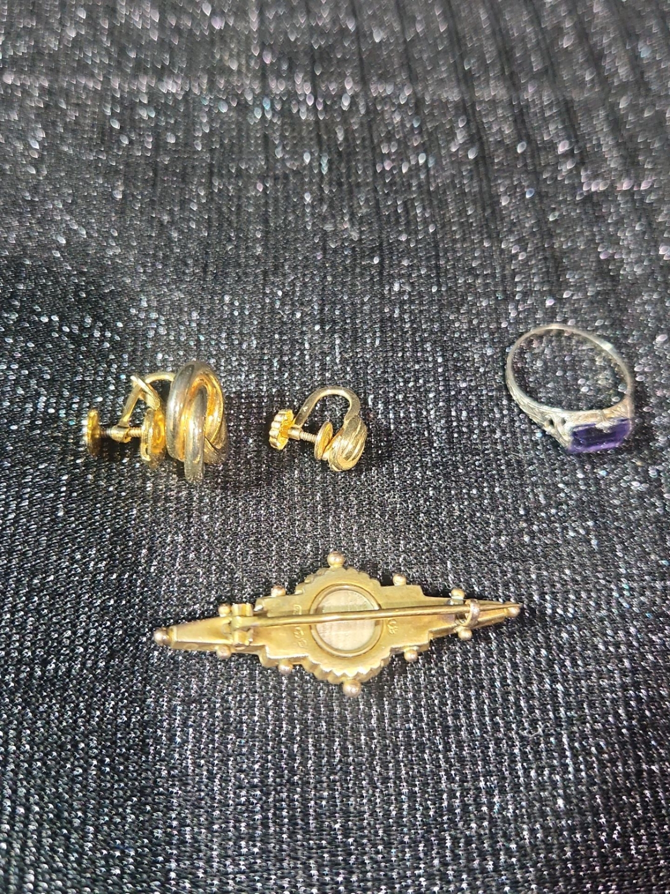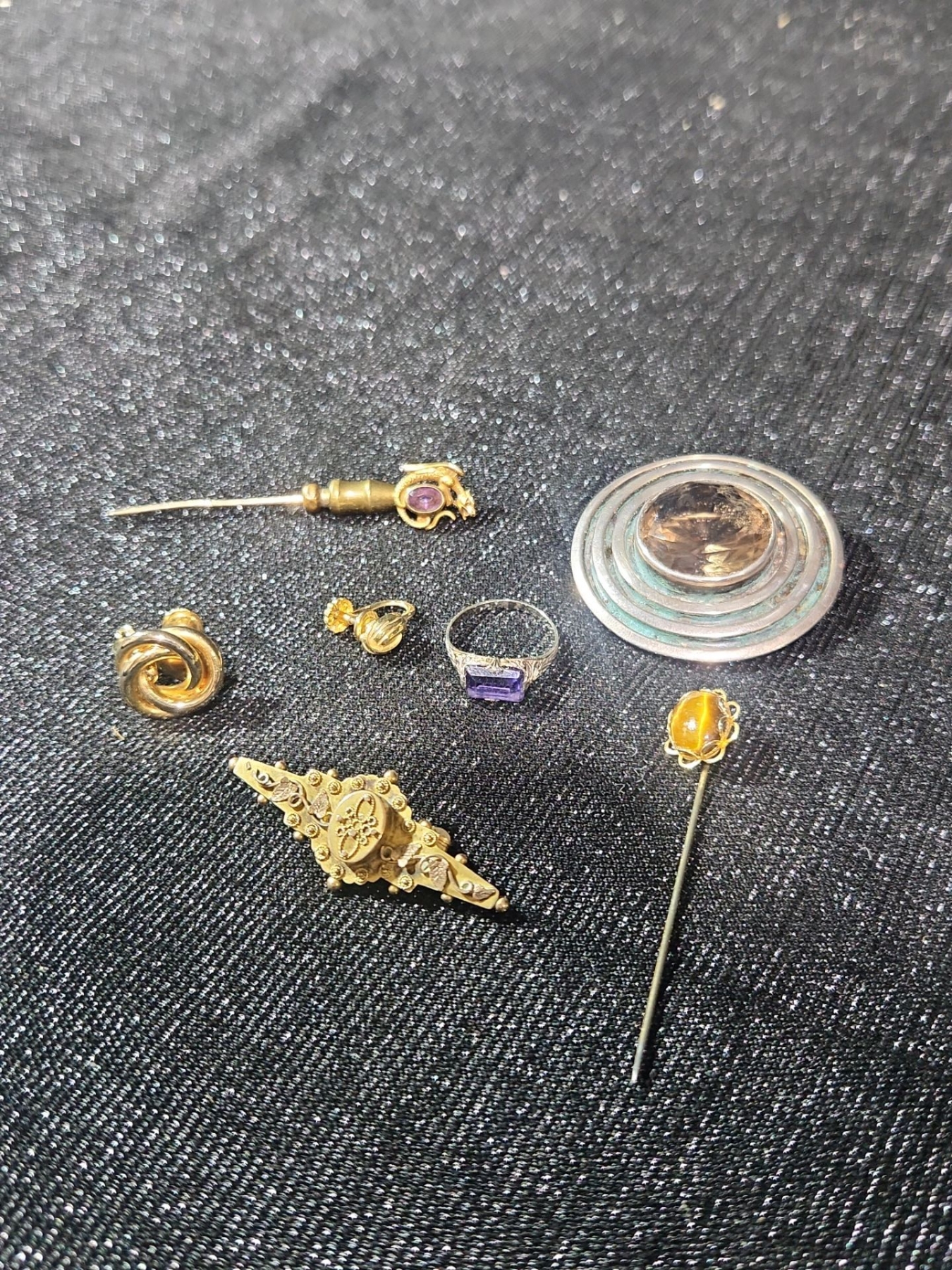 Assortment of timeless brooches , lapel/ hat pins , earrings and a purple stone set ring. Not sure of the ring size, though it does appear rather small