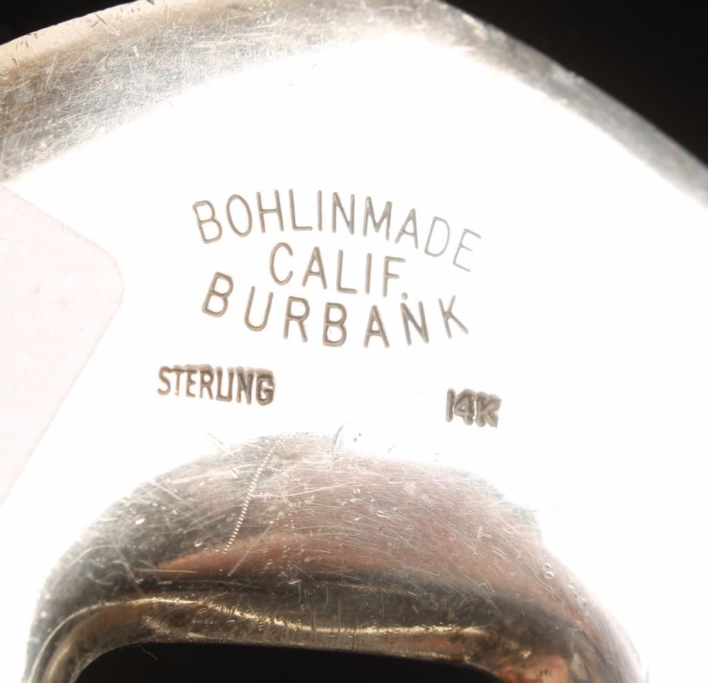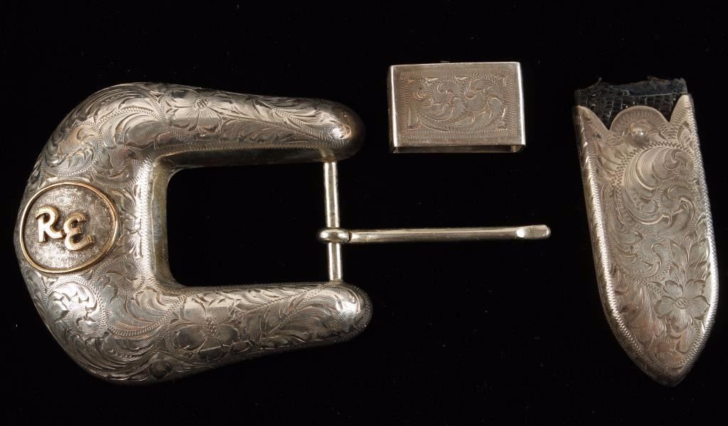 Constructed of sparkling sterling silver, made in Burbank, CA. Floral engraved design accented with a 14K yellow gold monogram 'RE'.