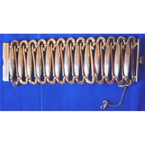 Is a splendid bracelet , unique design, signed by Monet , gold plated, with a security chaine. Size: 8.5" L x 3" W