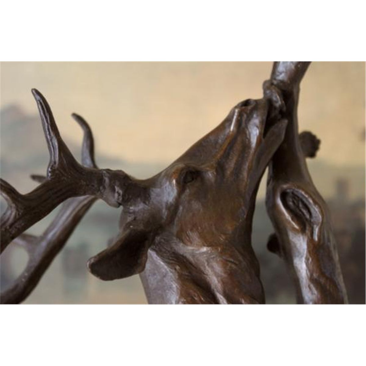Elk and Tree Bronze Sculpture, After PJ Mene 16"H x 17"L x 7"D 38lbs. This bronze sculpture was produced using the "Lost Wax" casting method. The"Lost Wax" Cast method is the most precise metal casting technique in existence, ensuring exquisite detail of the original host model which is usually sculpted in clay or wax. This "Lost Wax" casting method is an extremely labor intensive and expensive process, but the end results produce a Heirloom Quality Masterpiece!Pierre Jules Mêne, (1810 -1879), was a FrenchSculptor andanimalière. He is considered the pioneer of animal sculpture in the nineteenth-century.Mêne produced a number of animal sculptures, mainly of domestic animals including horses, cows and bulls, sheep and goats which were in vogue during the Second Empire. He was one of a school of French animalières which also included Rosa Bonheur, Pierre Louis Rouillard, Antoine-Louis Barye, Auguste Caïn, and François Pompon.His work was first shown in London by Ernest Gambart in 1849. Mêne specialized in small bronze figures which explains why none of his works exist as public statuary. His work was a popular success with the bourgeois class and many editions of each sculpture were made, often to decorate an increasing number of private homes of the period. The quality of these works is high, comparable to Barye's. Mêne also seems to have enjoyed a longer period of success and celebrity than his contemporaries. He is considered to have been the lost-wax casting expert of his time, later surpassed only by Auguste Rodin.The elk, or wapiti (Cervus canadensis), is one of the largest species of deer in the world and one of the largest mammals inNorth America and eastern Asia.