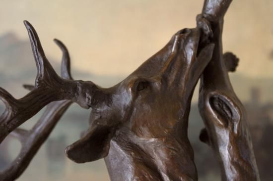 Elk and Tree Bronze Sculpture, After PJ Mene 16"H x 17"L x 7"D 38lbs. This bronze sculpture was produced using the "Lost Wax" casting method. The"Lost Wax" Cast method is the most precise metal casting technique in existence, ensuring exquisite detail of the original host model which is usually sculpted in clay or wax. This "Lost Wax" casting method is an extremely labor intensive and expensive process, but the end results produce a Heirloom Quality Masterpiece!Pierre Jules Mêne, (1810 -1879), was a FrenchSculptor andanimalière. He is considered the pioneer of animal sculpture in the nineteenth-century.Mêne produced a number of animal sculptures, mainly of domestic animals including horses, cows and bulls, sheep and goats which were in vogue during the Second Empire. He was one of a school of French animalières which also included Rosa Bonheur, Pierre Louis Rouillard, Antoine-Louis Barye, Auguste Caïn, and François Pompon.His work was first shown in London by Ernest Gambart in 1849. Mêne specialized in small bronze figures which explains why none of his works exist as public statuary. His work was a popular success with the bourgeois class and many editions of each sculpture were made, often to decorate an increasing number of private homes of the period. The quality of these works is high, comparable to Barye's. Mêne also seems to have enjoyed a longer period of success and celebrity than his contemporaries. He is considered to have been the lost-wax casting expert of his time, later surpassed only by Auguste Rodin.The elk, or wapiti (Cervus canadensis), is one of the largest species of deer in the world and one of the largest mammals inNorth America and eastern Asia.