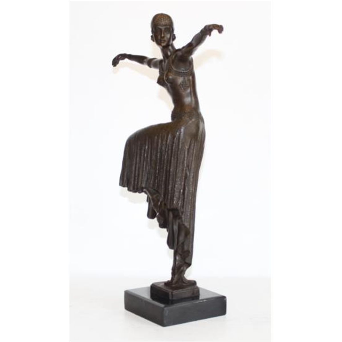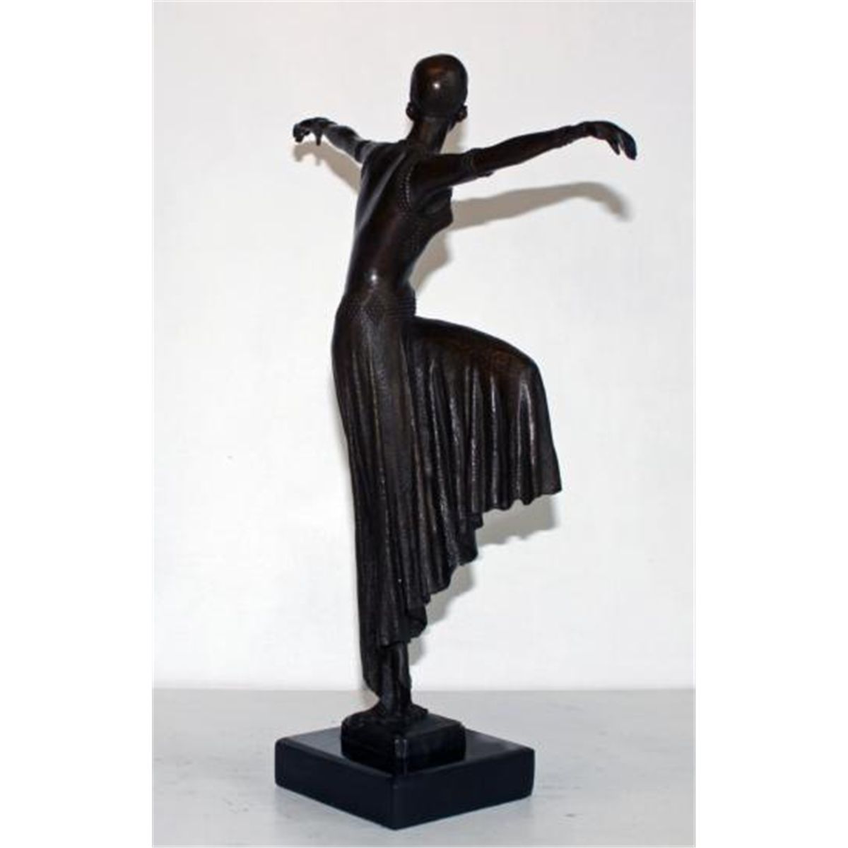 Flapper Girl, Art Deco Dancer Bronze Sculpture, After Noee 9 "H x 11"W x 11"D 16 lbs. This bronze sculpture was produced using the "Lost Wax" casting method. The"Lost Wax" Cast method is the most precise metal casting technique in existence, ensuring exquisite detail of the original host model which is usually sculpted in clay or wax. This "Lost Wax" casting method is an extremely labor intensive and expensive process, but the end results produce a Heirloom Quality Masterpiece!