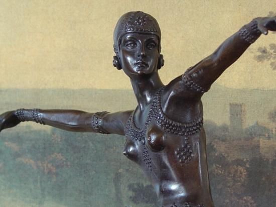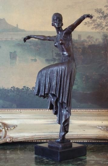 Flapper Girl, Art Deco Dancer Bronze Sculpture, After Noee 9 "H x 11"W x 11"D 16 lbs. This bronze sculpture was produced using the "Lost Wax" casting method. The"Lost Wax" Cast method is the most precise metal casting technique in existence, ensuring exquisite detail of the original host model which is usually sculpted in clay or wax. This "Lost Wax" casting method is an extremely labor intensive and expensive process, but the end results produce a Heirloom Quality Masterpiece!