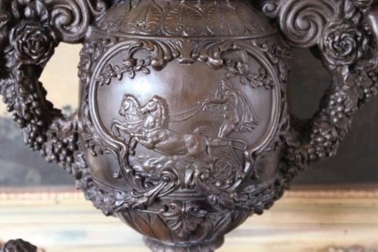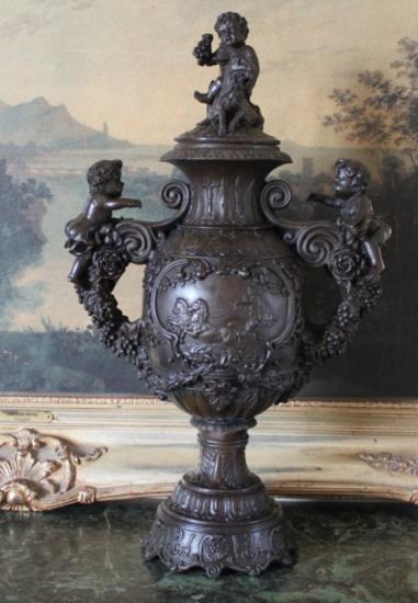 Ornate Memorial Urn, Bronze Sculpture, 21" H x 6.5"W x 13" D 25 lbs This bronze sculpture was produced using the "Lost Wax" casting method. The"Lost Wax" Cast method is the most precise metal casting technique in existence, ensuring exquisite detail of the original host model which is usually sculpted in clay or wax. This "Lost Wax" casting method is an extremely labor intensive and expensive process, but the end results produce a Heirloom Quality Masterpiece!