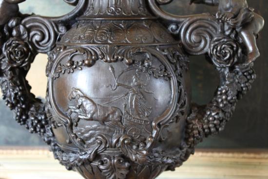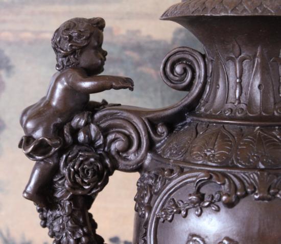 Ornate Memorial Urn, Bronze Sculpture, 21" H x 6.5"W x 13" D 25 lbs This bronze sculpture was produced using the "Lost Wax" casting method. The"Lost Wax" Cast method is the most precise metal casting technique in existence, ensuring exquisite detail of the original host model which is usually sculpted in clay or wax. This "Lost Wax" casting method is an extremely labor intensive and expensive process, but the end results produce a Heirloom Quality Masterpiece!