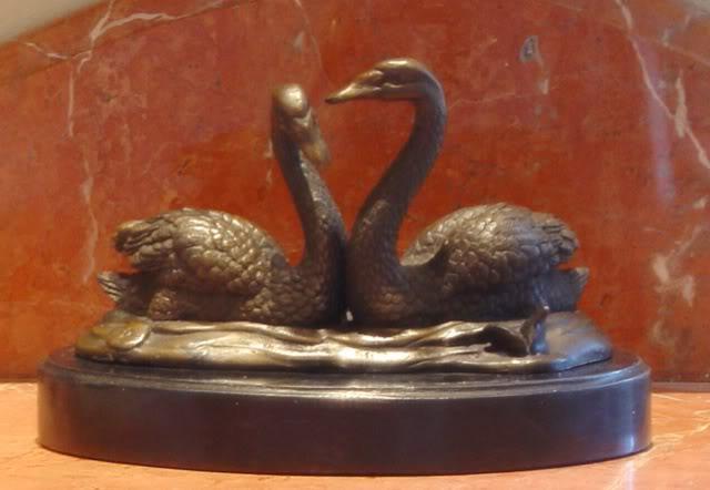 Two Swans Bronze Sculpture, 6"H x 9"W x 6"D11 lbs. This bronze sculpture was produced using the "Lost Wax" casting method. The"Lost Wax" Cast method is the most precise metal casting technique in existence, ensuring exquisite detail of the original host model which is usually sculpted in clay or wax. This "Lost Wax" casting method is an extremely labor intensive and expensive process, but the end results produce a Heirloom Quality Masterpiece!