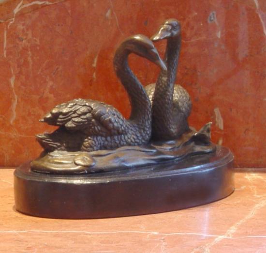Two Swans Bronze Sculpture, 6"H x 9"W x 6"D11 lbs. This bronze sculpture was produced using the "Lost Wax" casting method. The"Lost Wax" Cast method is the most precise metal casting technique in existence, ensuring exquisite detail of the original host model which is usually sculpted in clay or wax. This "Lost Wax" casting method is an extremely labor intensive and expensive process, but the end results produce a Heirloom Quality Masterpiece!