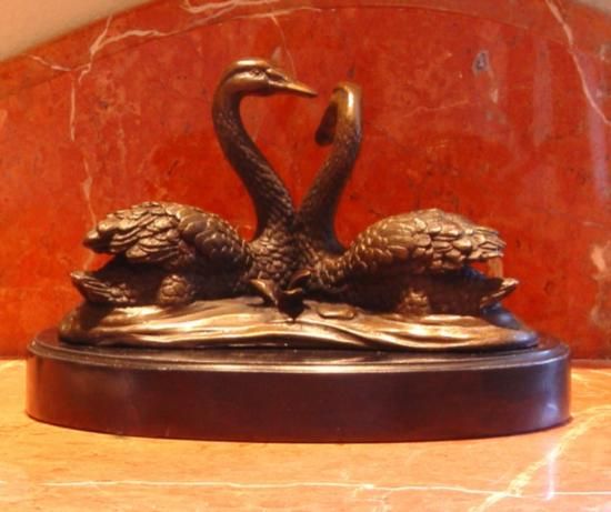 Two Swans Bronze Sculpture, 6"H x 9"W x 6"D11 lbs. This bronze sculpture was produced using the "Lost Wax" casting method. The"Lost Wax" Cast method is the most precise metal casting technique in existence, ensuring exquisite detail of the original host model which is usually sculpted in clay or wax. This "Lost Wax" casting method is an extremely labor intensive and expensive process, but the end results produce a Heirloom Quality Masterpiece!