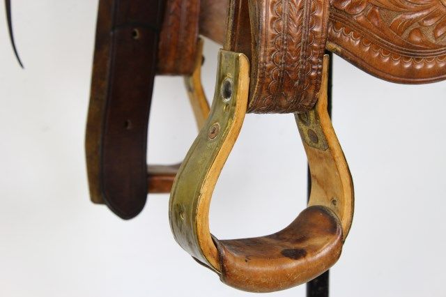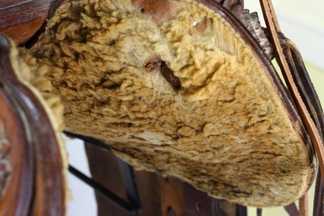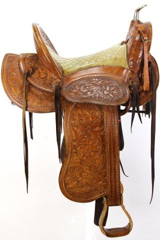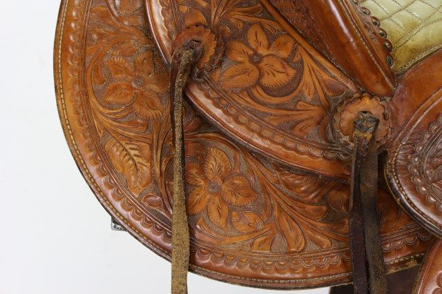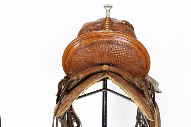round skirt, 6 string, made for Mrs. Nora Stoddard her initials carve into back of seat. John Stoddard Ranch was located 9 miles south of Sentinel Butte ND, saddle built approx. 1915, purchased from the family many years ago by old time ND collector Doug Janke. A well known sought after saddle to the veteran collectors of ND. Saddle remains in remarkable condition, full floral carved with birds on jockeys, 14 1/2" quilted padded seat , nickel horn, original lining and stitching. Sentinel Saddlery Co. 400 stamped on cinch strap holder, only replaced items are left and right rope straps. Leather remains soft and supple with great color. Sentinel Butte Saddlery was founded by WF Lucas approx. 1900, sold his shop to Lewis F Crawford who expanded into Beach, Belfield and Dickenson ND, later into Glendive, Terry, Baker and Lewiston MT. Outstanding saddle with great ND history, certainly the best if not one of the best Sentinel Butte saddles available, includes fine leather braided quirt marked Gopher Brand on popper. Est. 8000-12000