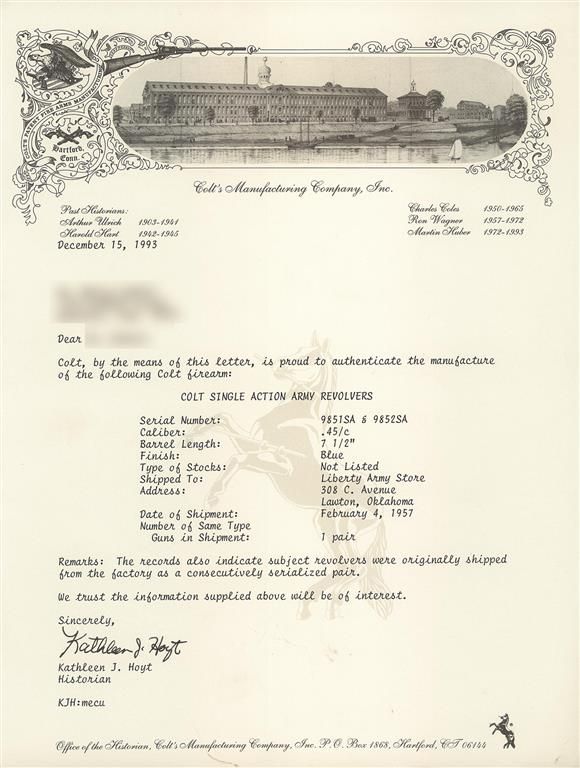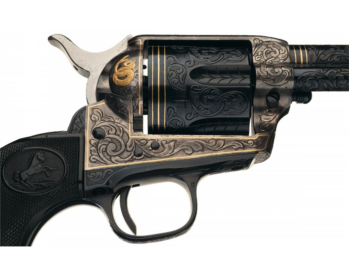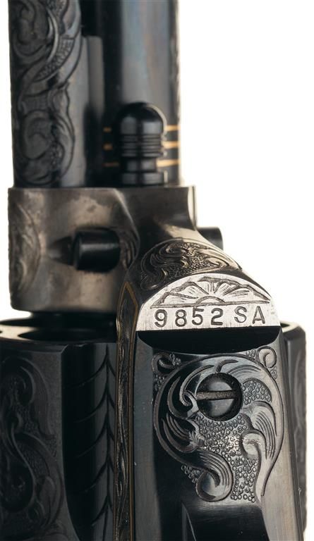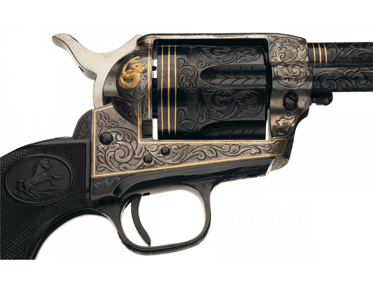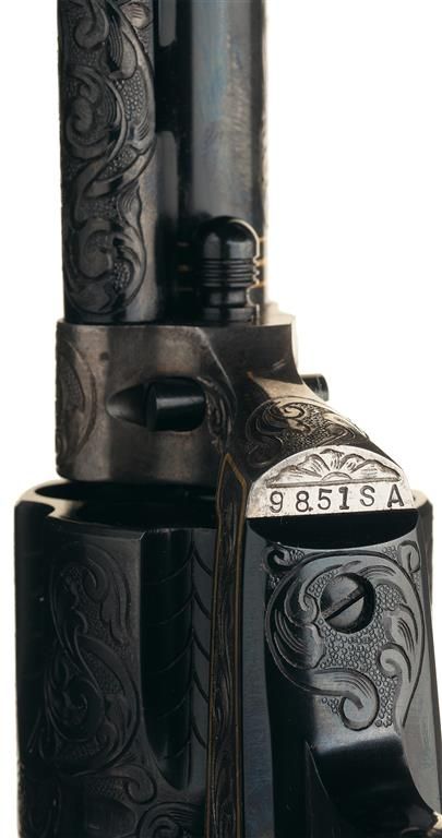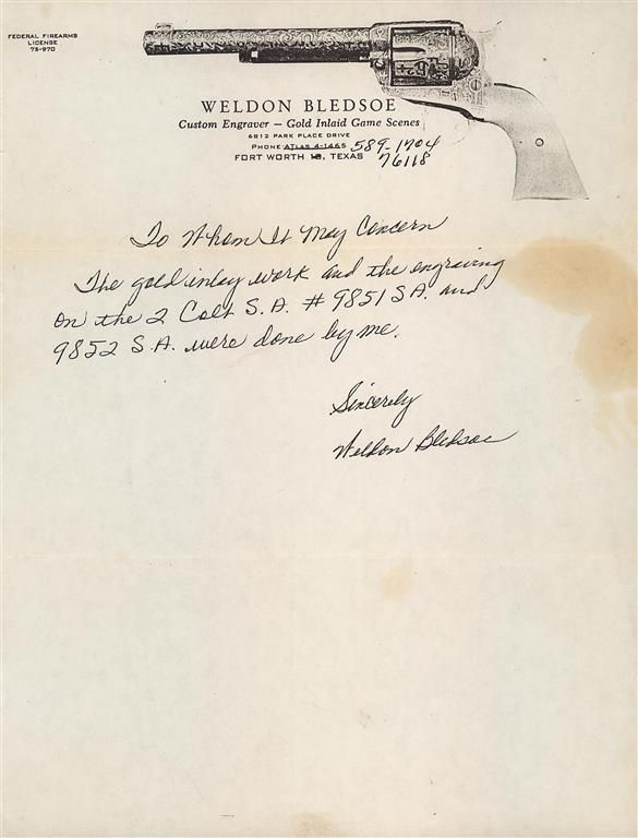 A) Manufactured in 1957 and subsequently engraved and gold inlaid by Master Engraver Weldon Bledsoe. Included with the revolvers is a signed handwritten note from Weldon Bledsoe on his letterhead which states "To Whom It May Concern The gold inlay work and engraving on the 2 Colt S.A. # 9851SA and 9852 SA were done by me." This matching pair of revolvers feature beautiful floral scroll engraving with a punch dot background on the barrel, ejector housing, frame, cylinder flats, back strap and trigger guard. There is a simple pattern in the cylinder flutes. There are three gold inlaid wire bands around the muzzle and breech of the barrel, three gold inlaid wire bands around the rear of the cylinder and a simple gold inlaid wire border on the frame sides. The recoil shield has a gold relief covered wagon being pulled by two oxen and the loading gate features a gold relief coiled rattle snake. Directly below the right side recoil shield is signed "WB". The top of the barrel is marked with the one line address, the left side is marked "COLT SINGLE ACTION ARMY .45" and the left side of the frame is marked with the two line, three patent dates followed by the Rampant Colt. All the markings are in decorative panels. The matching serial number is marked on the bottom of the frame, on the left side of the grip straps under the grip and on the inside of each grip panel. The assembly number "694" is marked on the right rear of the frame and on the loading gate. Standard blade front and frame notch rear sights, blue finish with bright frame, and fitted with checkered hard rubber grips with the Rampant Colt in an oval at the top. The accompanying factory letter verifies the two as being shipped as a consecutively serial numbered pair, caliber, barrel length, blue finish with grips as "Not Listed" and that they were shipped to Liberty Army Store in Lawton, Oklahoma on February 4, 1957. The pair come in a wooden case with fitted red velvet lining.