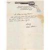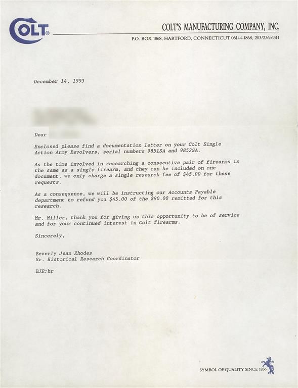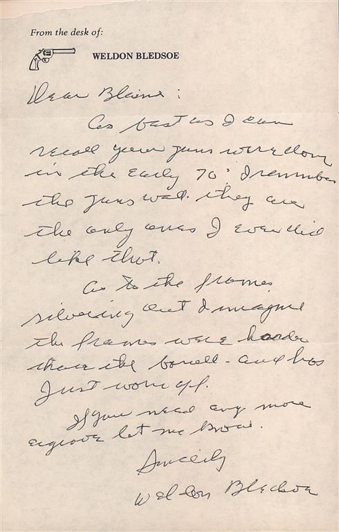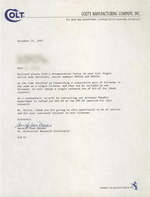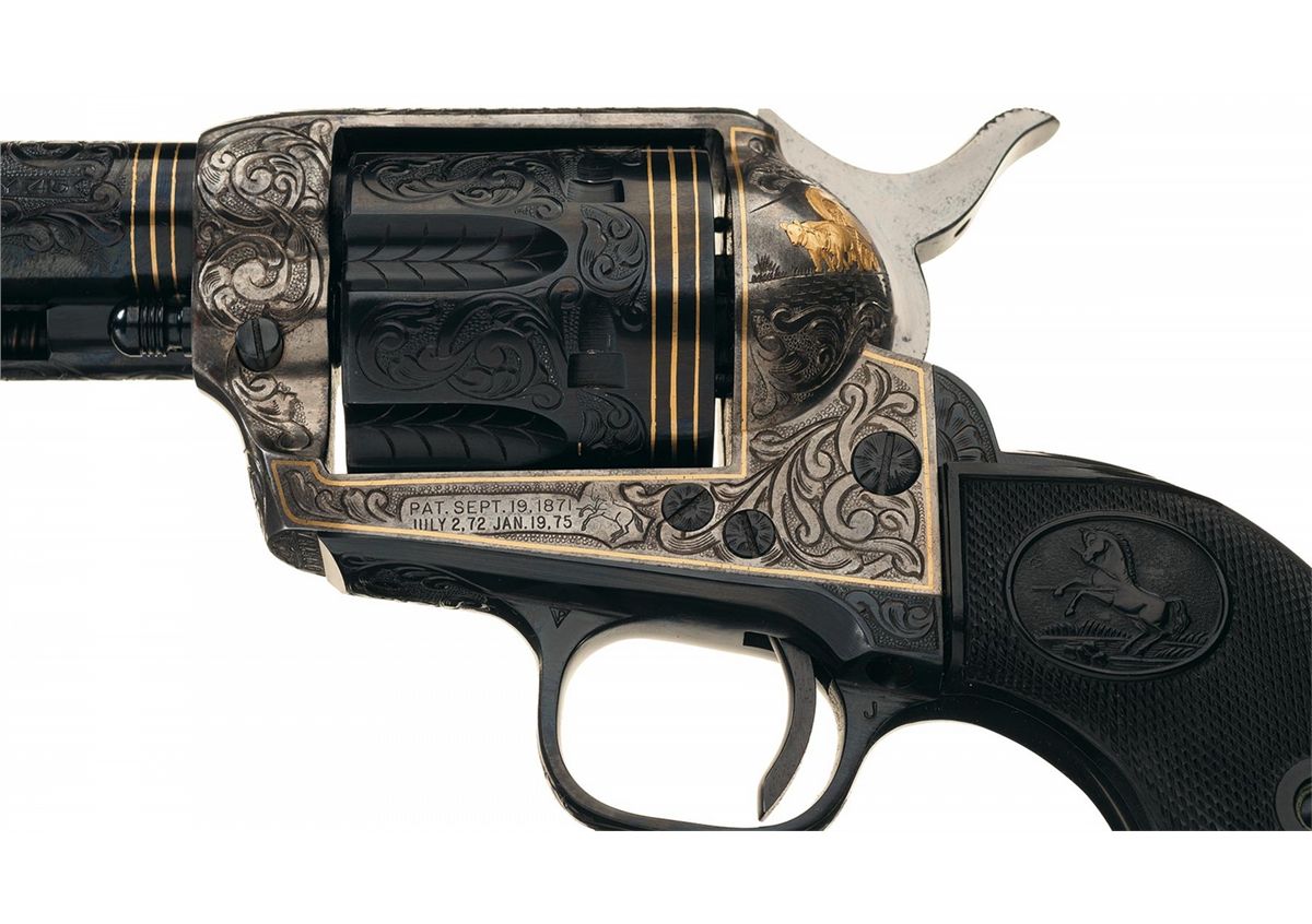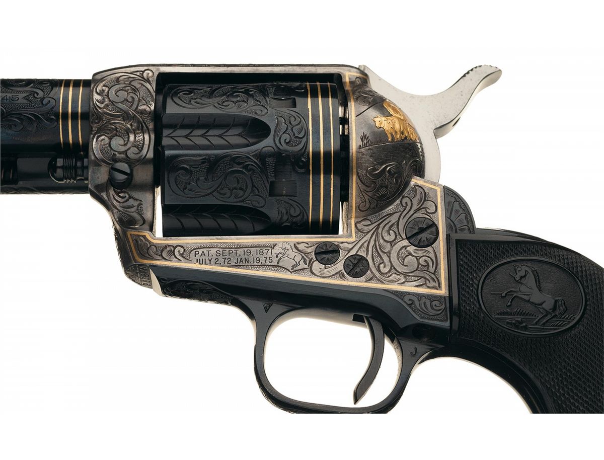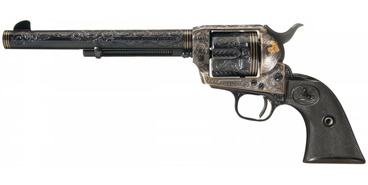 A) Manufactured in 1957 and subsequently engraved and gold inlaid by Master Engraver Weldon Bledsoe. Included with the revolvers is a signed handwritten note from Weldon Bledsoe on his letterhead which states "To Whom It May Concern The gold inlay work and engraving on the 2 Colt S.A. # 9851SA and 9852 SA were done by me." This matching pair of revolvers feature beautiful floral scroll engraving with a punch dot background on the barrel, ejector housing, frame, cylinder flats, back strap and trigger guard. There is a simple pattern in the cylinder flutes. There are three gold inlaid wire bands around the muzzle and breech of the barrel, three gold inlaid wire bands around the rear of the cylinder and a simple gold inlaid wire border on the frame sides. The recoil shield has a gold relief covered wagon being pulled by two oxen and the loading gate features a gold relief coiled rattle snake. Directly below the right side recoil shield is signed "WB". The top of the barrel is marked with the one line address, the left side is marked "COLT SINGLE ACTION ARMY .45" and the left side of the frame is marked with the two line, three patent dates followed by the Rampant Colt. All the markings are in decorative panels. The matching serial number is marked on the bottom of the frame, on the left side of the grip straps under the grip and on the inside of each grip panel. The assembly number "694" is marked on the right rear of the frame and on the loading gate. Standard blade front and frame notch rear sights, blue finish with bright frame, and fitted with checkered hard rubber grips with the Rampant Colt in an oval at the top. The accompanying factory letter verifies the two as being shipped as a consecutively serial numbered pair, caliber, barrel length, blue finish with grips as "Not Listed" and that they were shipped to Liberty Army Store in Lawton, Oklahoma on February 4, 1957. The pair come in a wooden case with fitted red velvet lining.