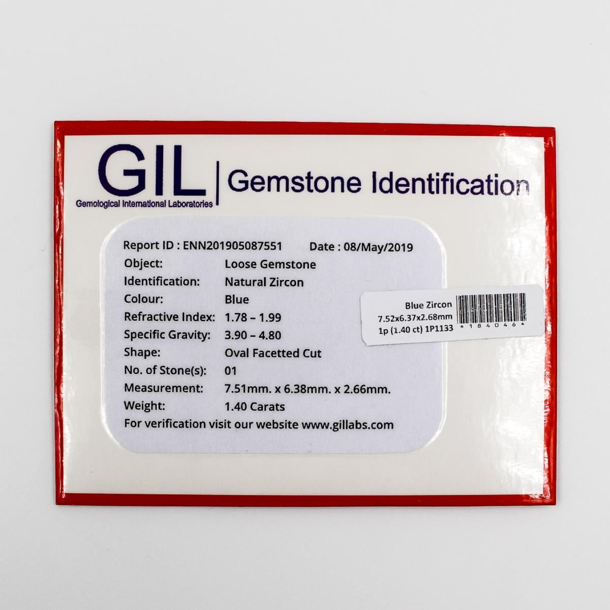 Beautiful Certified 1.40 Ct Natural Blie Zircon.This Cambodia Mined Zircon is an oval cut measuring 7.51 x 6.38 x 2.66 mm.
