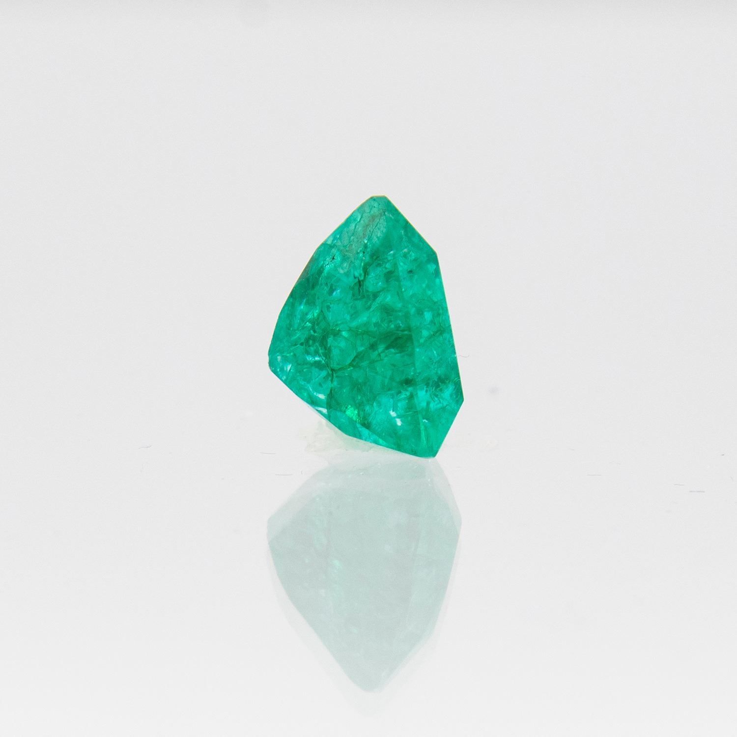 Beautiful certified 7.60 ct Colombian emerald solitaire. This emerald displays intense color saturation with a high luster and a strong vivid tony. Very transparent with a fine trillion cut measuring 12.62 c 12.53 x 8.56 mm. Emeralds have long been one of the most sought after and admired precious gems found on this great Earth. Ready to mount and be worn. Treated.