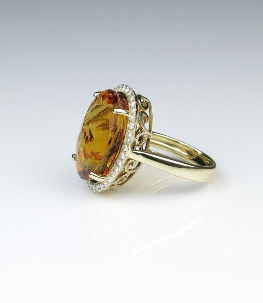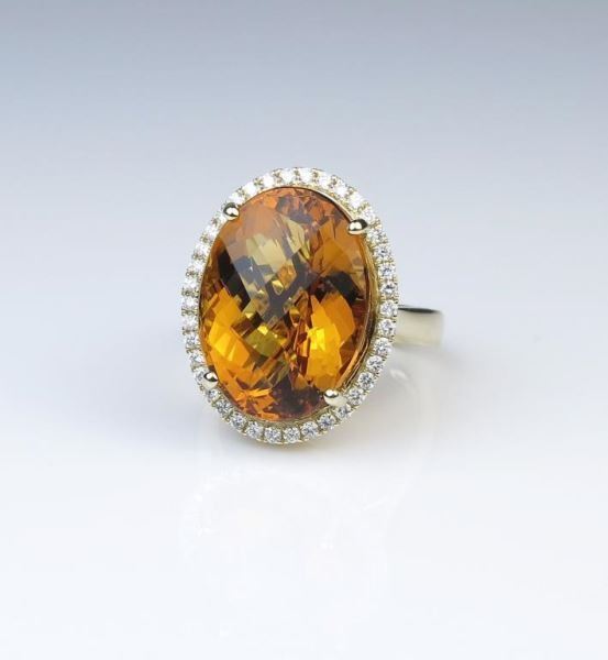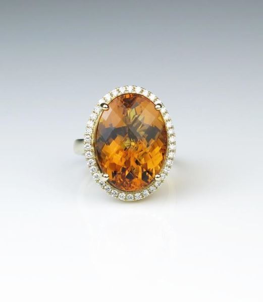 featuring an approx. 20.00 carats encircled with 36 'IDEAL' cut diamonds weighing approx. 0.70 carats with F-G colors and VS/SI clarity set in 14K white gold.