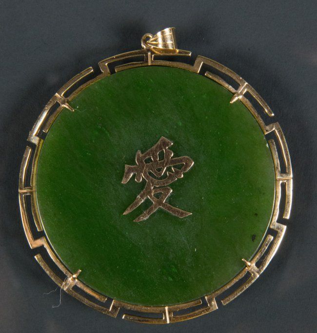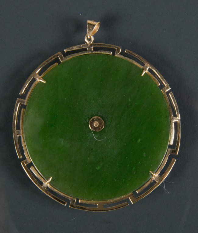 Beautiful Chinese jade disc 14k gold pendant; D: 5.8 cm, 20 grams
