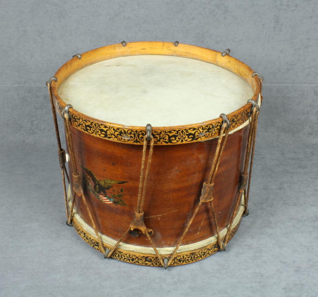 Beautiful Civil War drum with round wood  body, American flag and spread eagle decal;  drum is in overall very good condition and is  approx. 16” in diameter and approx. 13” in  height with woven stays holding drum headsonto body and decorated rims; view hole to  show maker label by Henry Eisele of New York.  This is one of the nicest drums of this type  we have seen in some time.  Est.:   $750-$1,500.