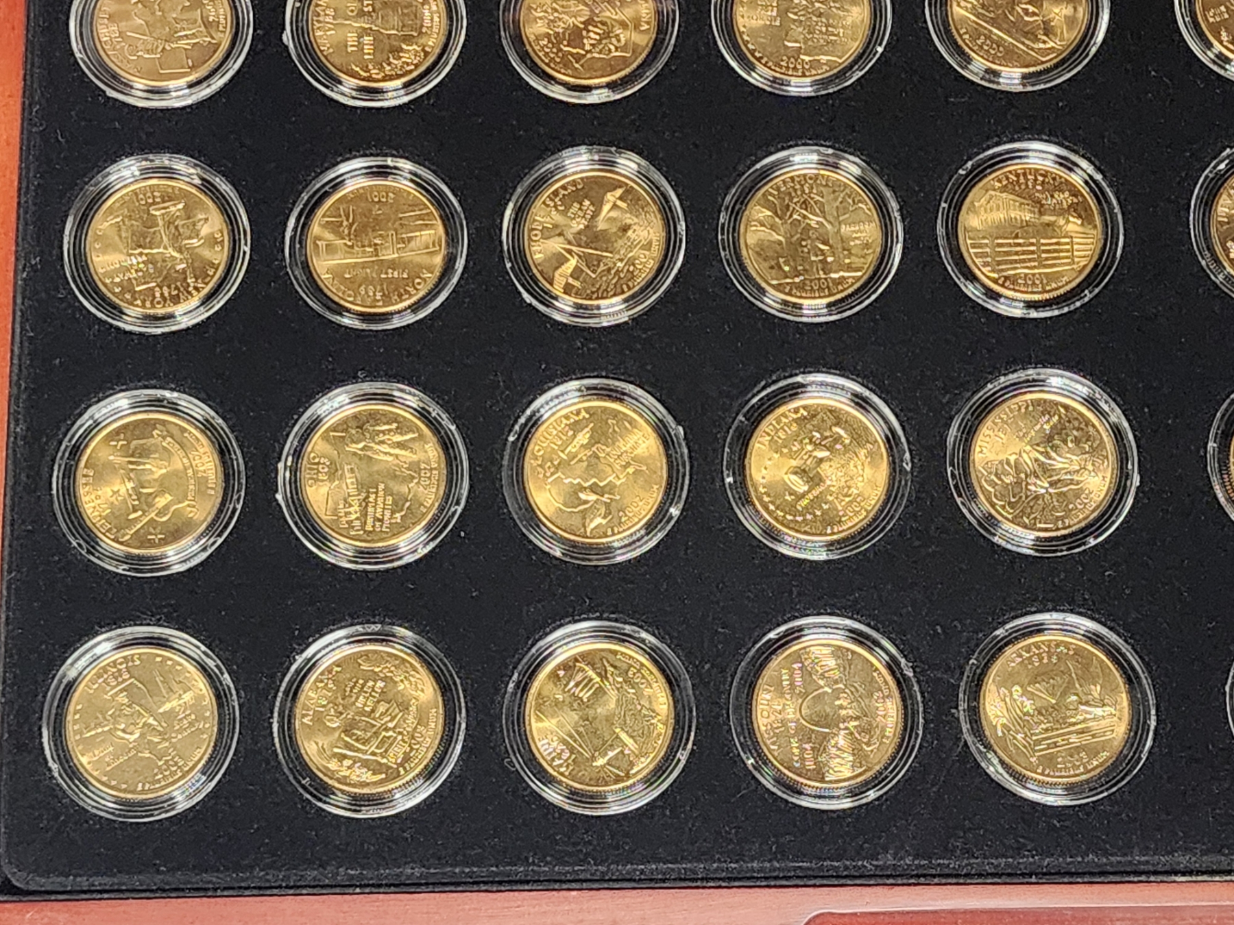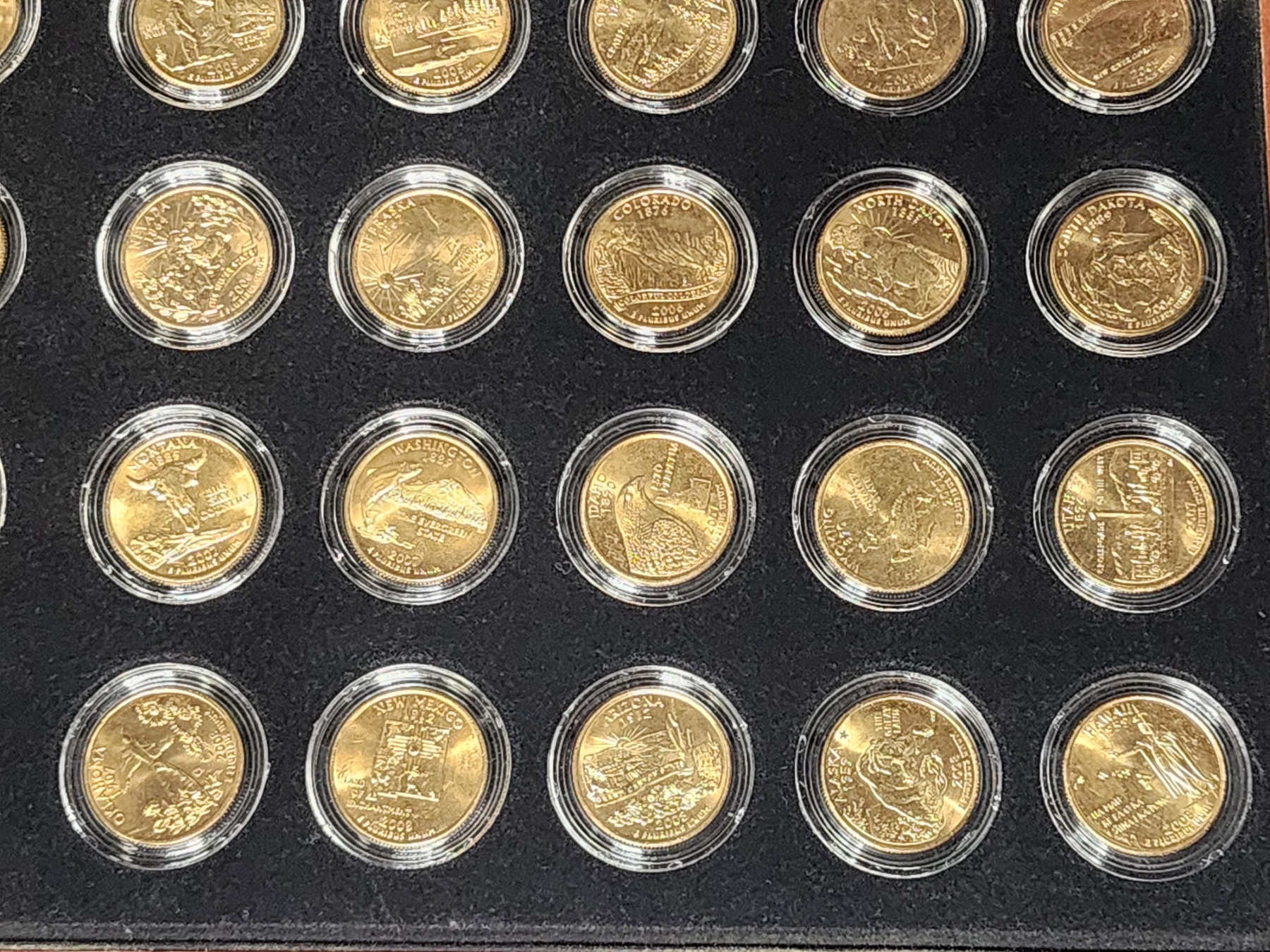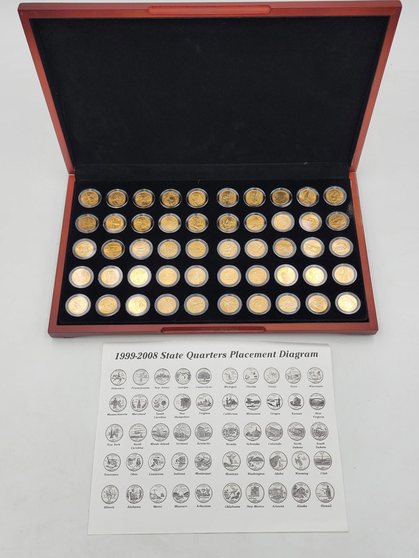 Beautiful Collection of 50 Gold-Plated U.S. State Quarters from 1999-2008 in Wooden Display Case