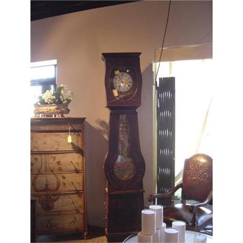 This is a beautiful French farm contoise. The pendulum and clock face area are repousse, while the clock case and pendulum are painted. There is a small missing piece of glass on the door, but this can be easily changed. The clock DOES work. This is one of the more beautiful French farm contoise clocks that you will find!