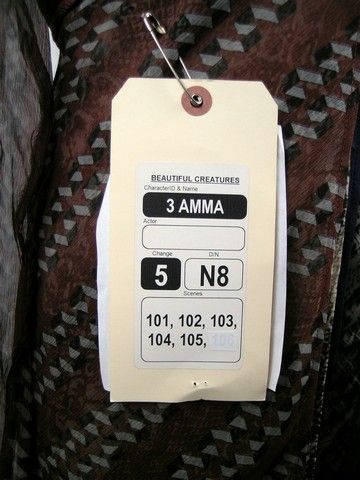 Amma (Viola Davis) screen worn, hero, brown silk chiffon with cranberry accents and diagonal print, stone closure at the bust robe, jersey knit with black and white print no sleeves shirt, navy and white print skirt, bangle bracelet, earrings, and black patent leather pumps. Includes wardrobe tag!
