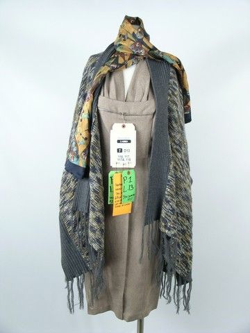 Amma (Viola Davis) tan small textured woven stripe dress with shawl-type collar. Grey/yellow/white wrap with solid grey border. Gold/blue/green/red multi color print silk scarf. Copper necklass and bracelet. Wardrobe tag included.
