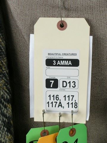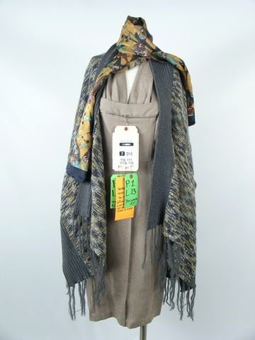 Amma (Viola Davis) tan small textured woven stripe dress with shawl-type collar. Grey/yellow/white wrap with solid grey border. Gold/blue/green/red multi color print silk scarf. Copper necklace and bracelet. Wardrobe tag included.