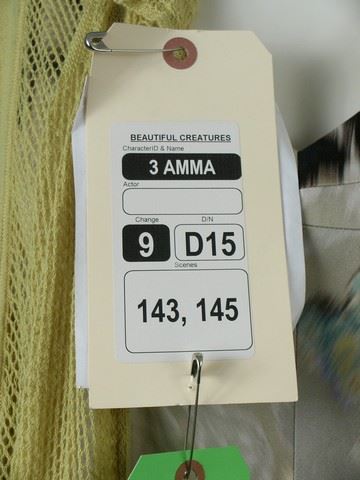 Amma (Viola Davis) heavy silk grey/yellow/black/white blurred flower print sleeveless dress and lemon yellow light weight "cardigan" w/no buttons l/s. Wardrobe tag included.