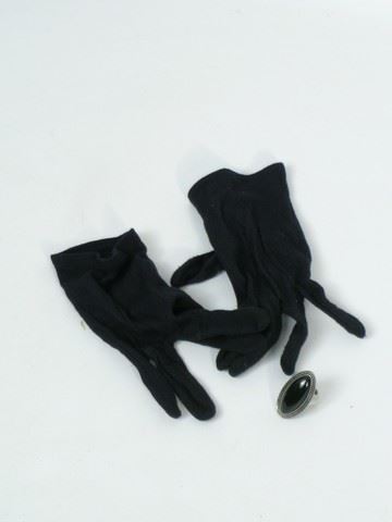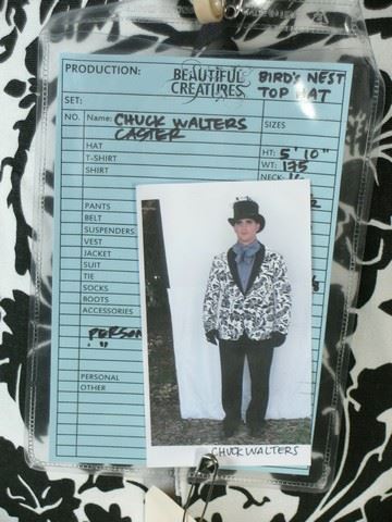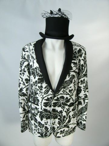 Beautiful Creatures "Caster" costume. White with black damash-style print coat and black shawl collar "Varvatos". Black cotton gloves. Silver rint with elasticized band and 1 1/2" smooth black marquis shaped stone. Black English style top hate with black netting, branches, and 2 birds on top. "Scala Classico". Wardrobe Tag Included.