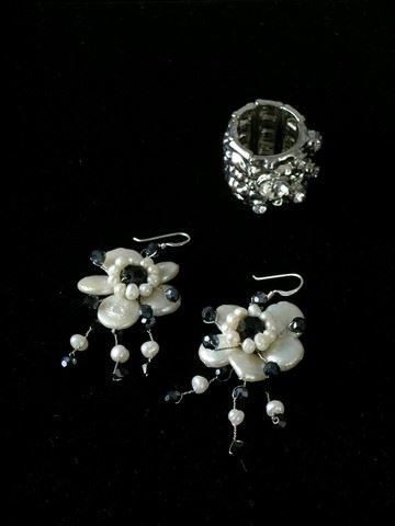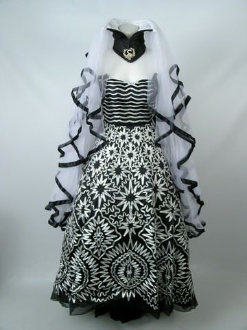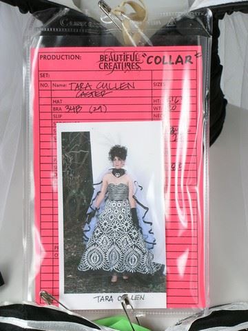Beautiful Creatures "Collar" Caster costume. A strapless black evening gown. Full skirt with built in black netting petticoat. White ribbon decoration of horizontal stripes on bodice and star burst motifs on skirt. "Blush Prom By Alexia" (size 10). Pleated black satin stand-up collar with layers of white netting edged with black satin ribbon attached. Black rayon extra long opera gloves (7 1/2) "Von Rolte Cor. Inc." Wide elasticized segment textured silver band ring, with varying size rhinestones. Mother of pearl flower earrings with black bead accents. French hook. Black and white enamel stork broach with wings raised overhead and mother of pearl body.and white glittered branches used to dress actors hair.