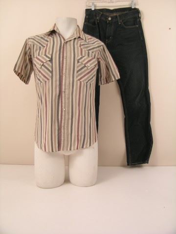 Ethan Wate (Alden Ehrenreich) screen worn, off-white with maroon and taupe stripes 'Ely Plains' shirt, and dark blue denim 'Levis' jeans. (size 30/32)