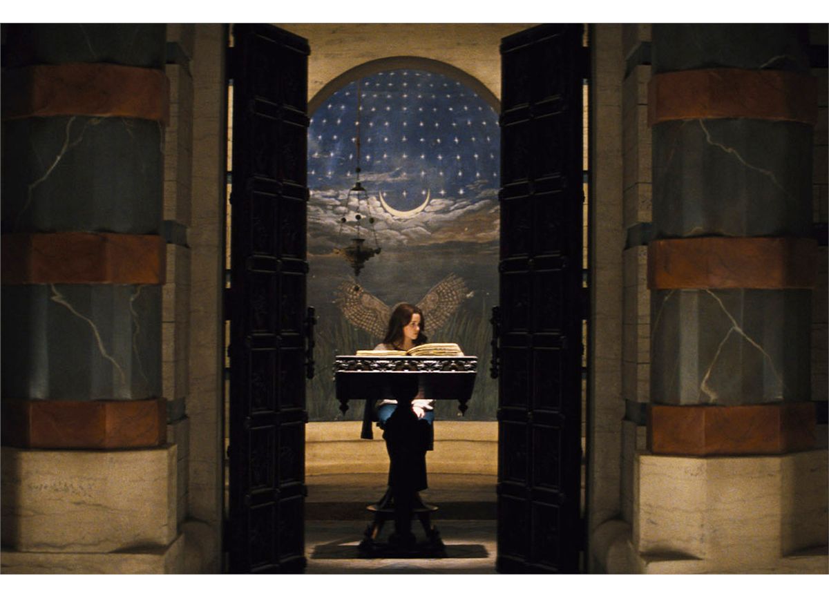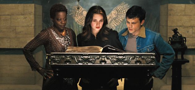 In the stunning supernatural romance thriller "Beautiful Creatures" (2013) Lena (Alice Englert), is about to turn sixteen, and being a witch, must deal both with a battle between good and evil within herself, her new found love, Ethan (Alden Ehrenreich), and an old family curse that could destroy not only her, but Ethan as well. She finds herself in the bowels of the local library where the secret books of witchery are kept, and the most powerful book of all: "The Book of Curses" is locked behind a massive vault. In that book may be the only answer she has for her own, and her loved ones redemption. This hero screen used book is that iconic secret "Book of Curses", in which the entire story hinges and therefore she spends days in a desperate search for the answers in the book. It's a magnificent piece, in very heavy leather with magnetic straps on the side and sun and moon symbols on the front. Paper pages on the inside are blank. (approx. 14" x 18 1/2").
