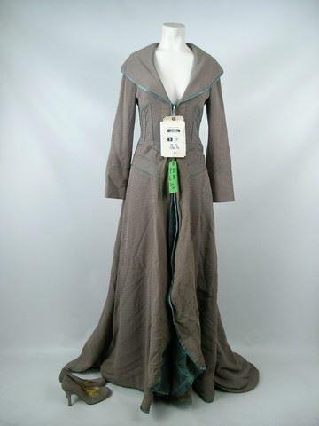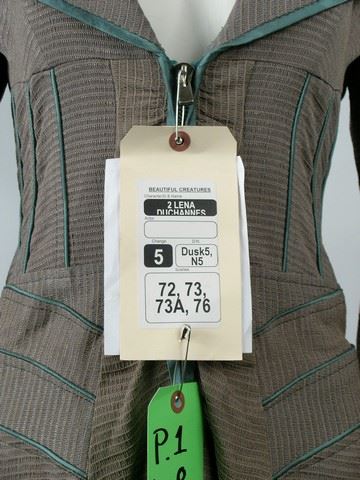 Lena Duchannes (Alice Englert) taupe/seafoam green slight stripe patterned fabric with seafoam green satin lining jacket with train in back. Light grey sued pumps "Nine West" (7.5). Wardrobe tag included.