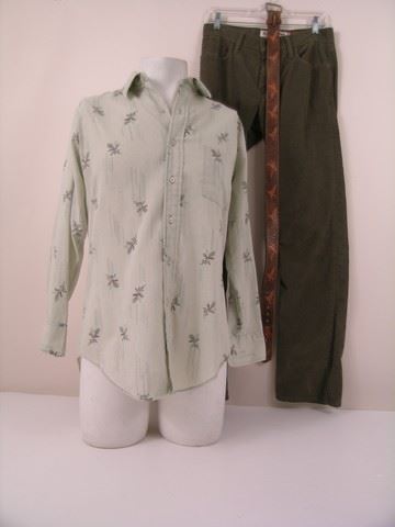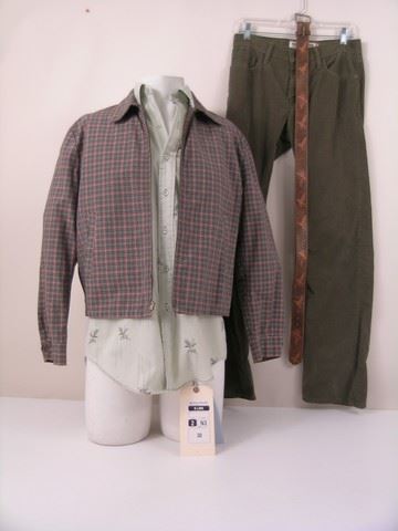 Link (Thomas Mann) screen worn, hero, multi color plaid 'Buck Skein' jacket, pale green with floral print 'Sutton' shirt, (size 15-15 1/2) light brown leather duck embossed belt, and olive corduroy 'Levis' pants. (size 29/32)