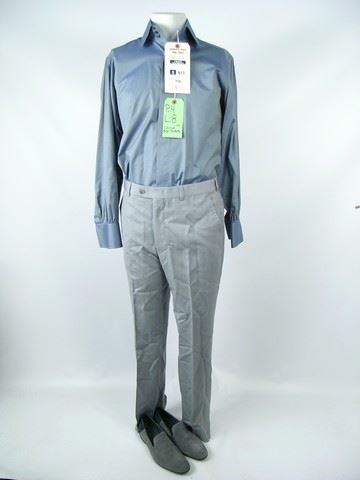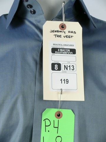 Macon Ravenwood (Jeremy Irons) teal l/s b/f "Anto" shirt and grey dress pants with "Aldo" grey suede loafers.