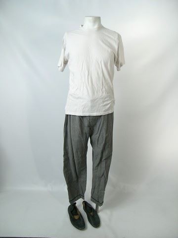 Mitchell Wate (J.D. Evermore) grey with green and brown plaid, long sleeve robe with tie belt "Polo: Ralph Lauren" (size M), teched white short sleeve crew neck t-shirt "Jockey" (size L), grey flannel herringbone PJ pants with drawstring waist "No Brand" (size L), and navey aged leather slip on loafers "Brooks Bro". Wardrobe tag included.